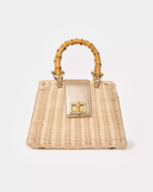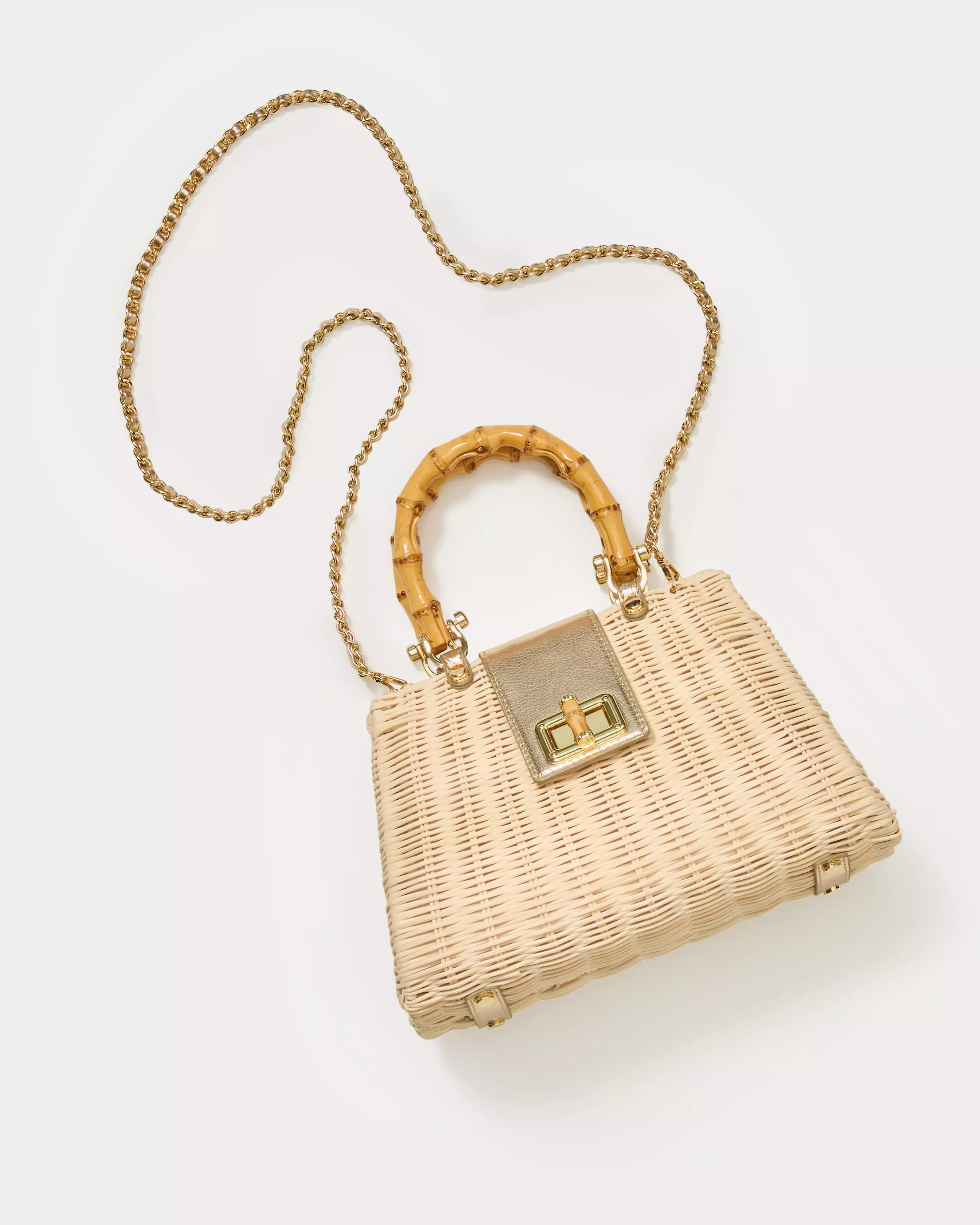 - Wicker bag with a natural bamboo top handle. Style also features an interior lining, turnlock closure, and a gold metal chain crossbody strap.
