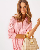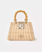 A versatile option for day-to-night wear, our Leena Top Handle bag is crafted from wicker with bamboo details and a gold chain strap.