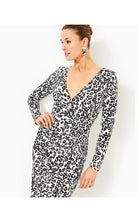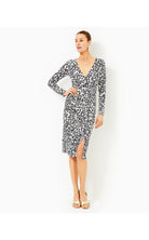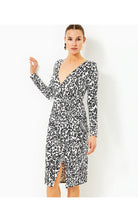 - Fitted, long sleeve, midi dress with a surplice neckline, twist waist detail, and slit at the front skirt.