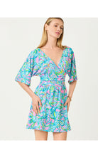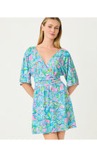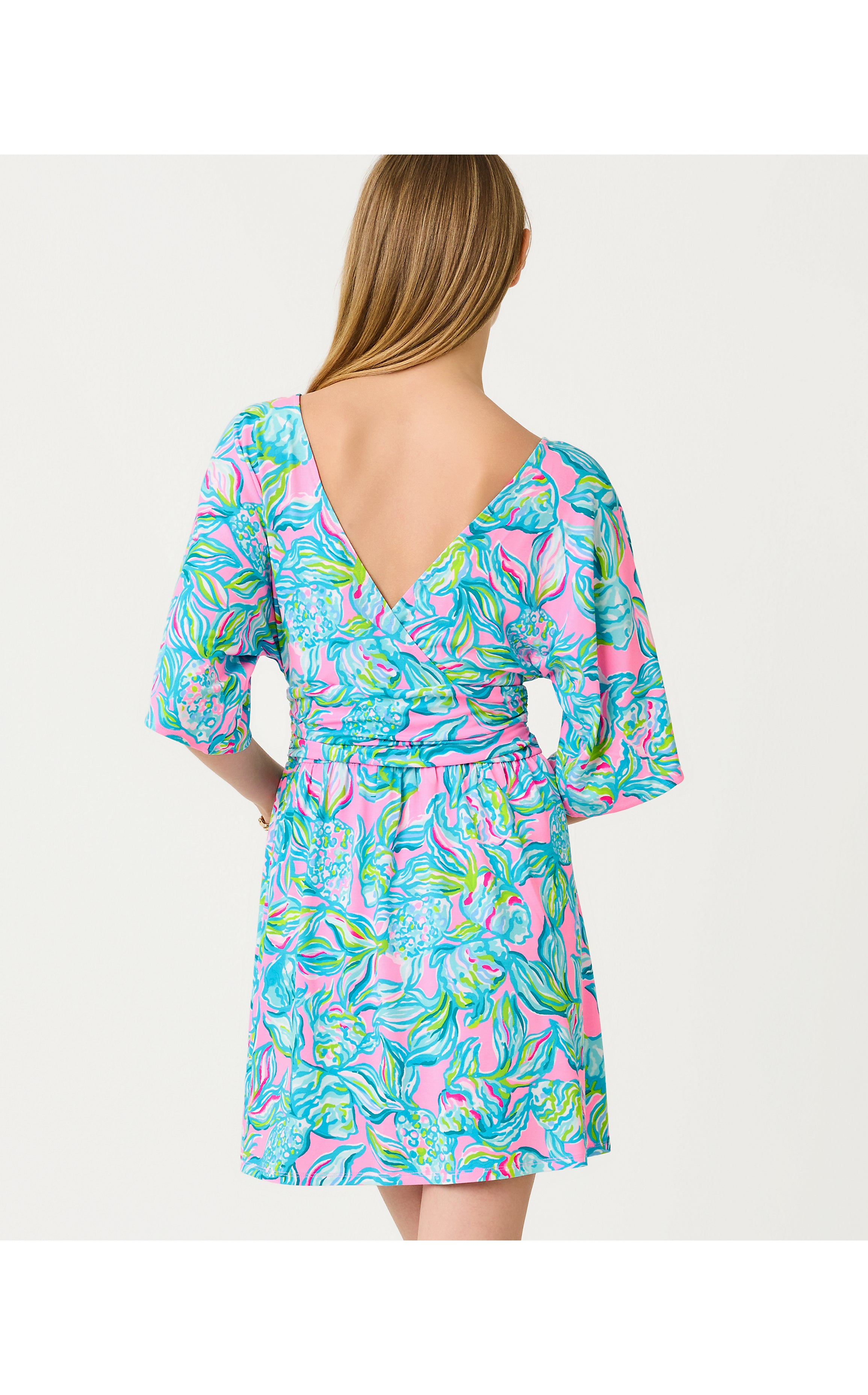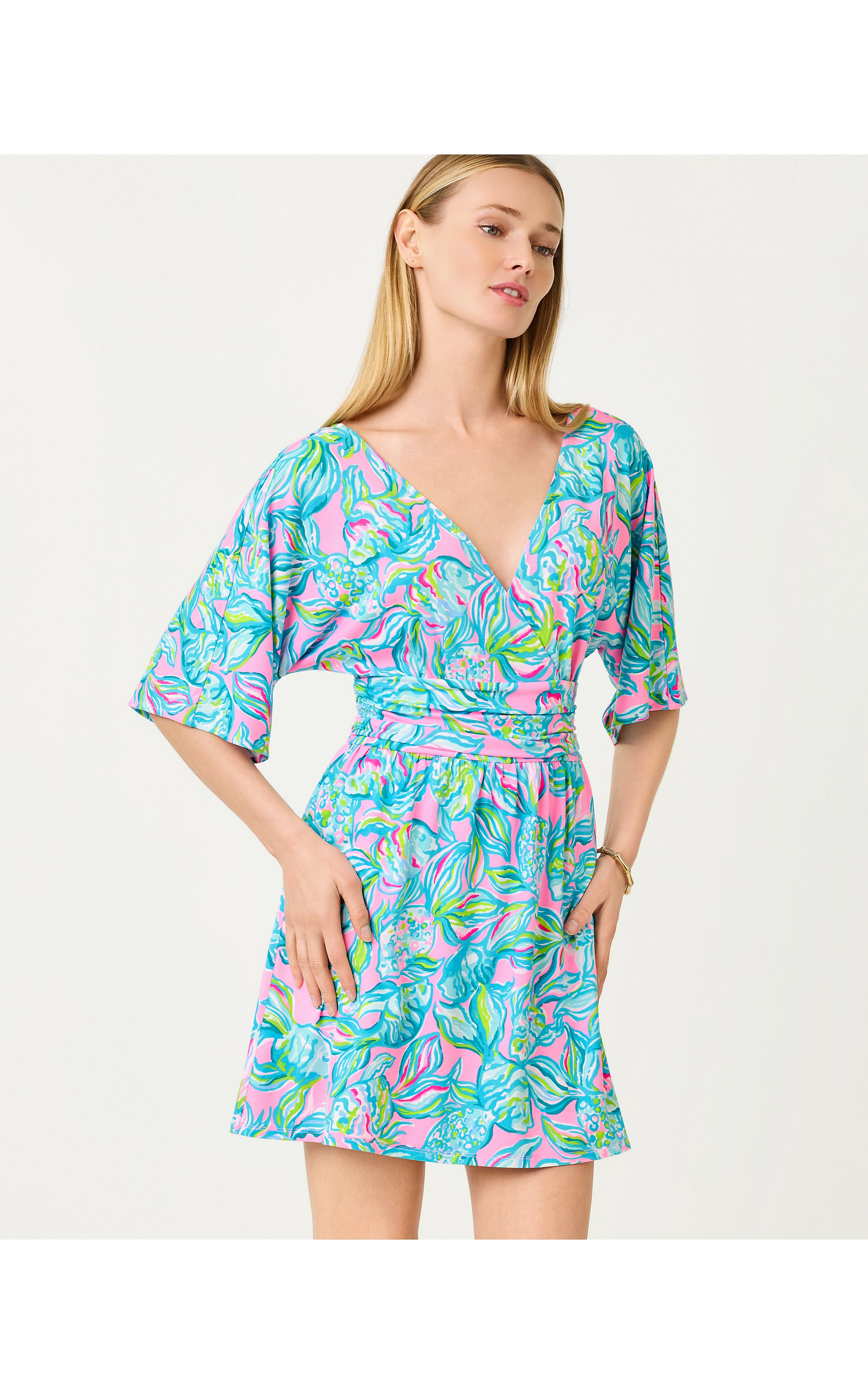 - Skirted romper with a surplice neckline, elbow-length kimono sleeves, and a ruched waistband.