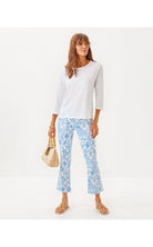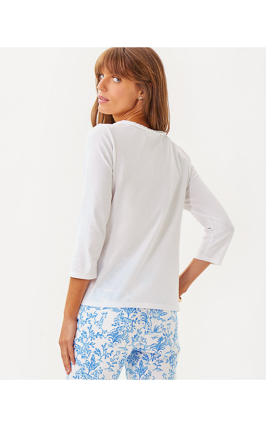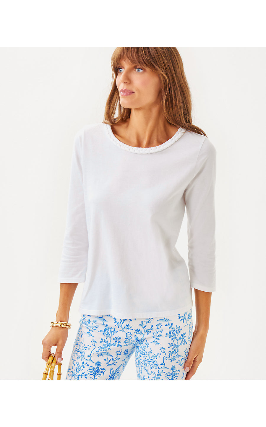 - Straight fit top with a braided trim crew neckline and 3/4 sleeves.