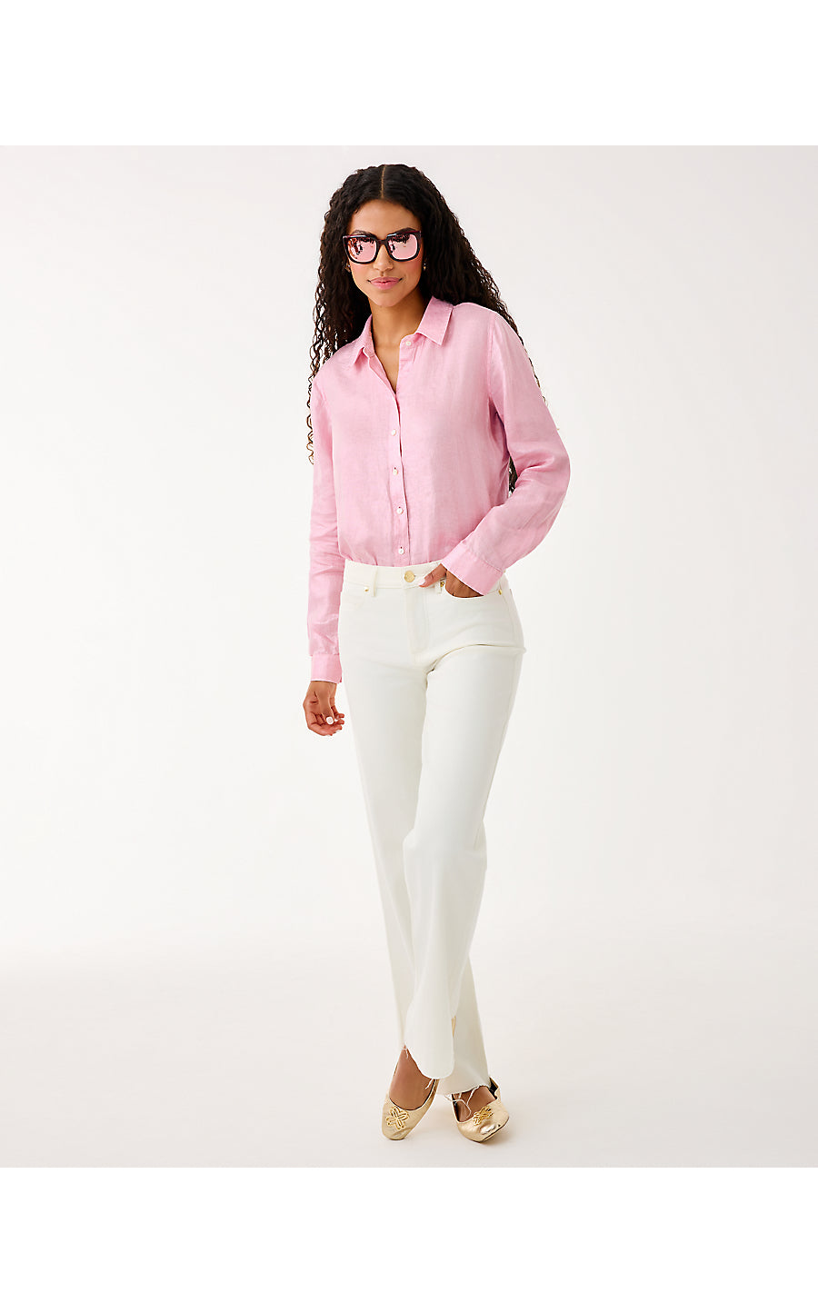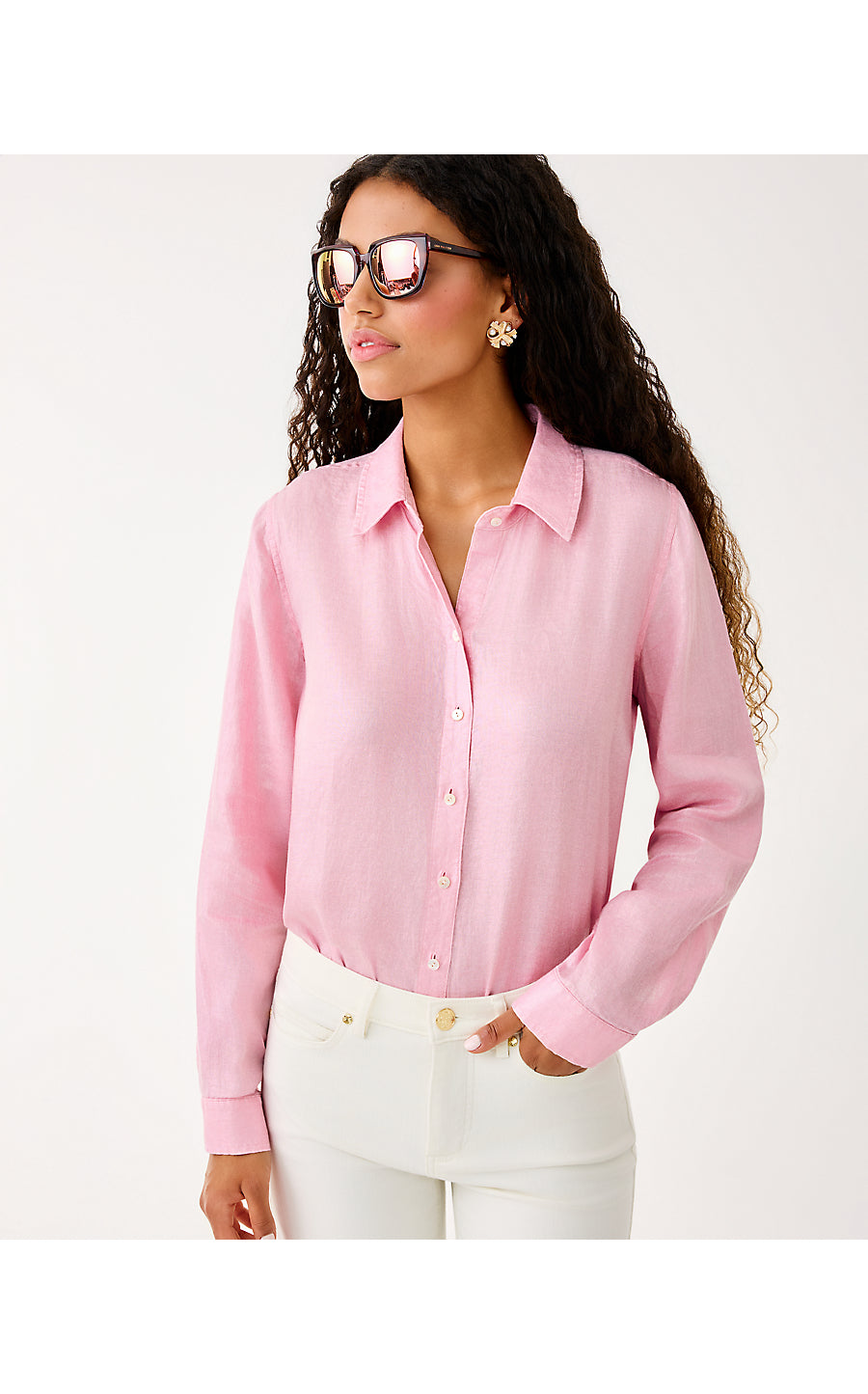 Sea View Metallic Linen Button Down - Conch Shell Pink Foil