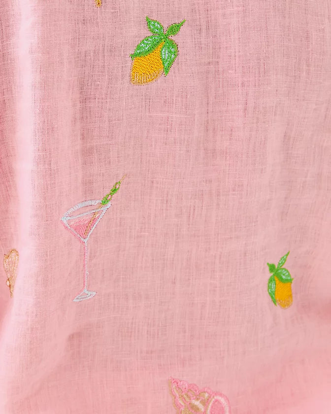 Sea View Linen Button Down Top - Conch Shell Pink Happy Hour Embroidery