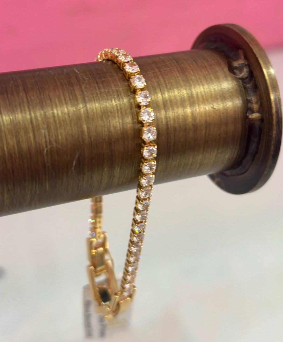 Add a touch of timeless radiance to your jewelry collection with the Alyssa Bracelet in Gold Metallic—an elegant blend of classic sparkle and modern sophistication. This stunning bracelet features a continuous row of brilliantly faceted stones, each meticulously set to create a seamless line of shimmer that dances in the light. The gold-tone metal enhances the brilliance of the stones, offering a warm, luxurious finish that complements a wide range of styles and skin tones.