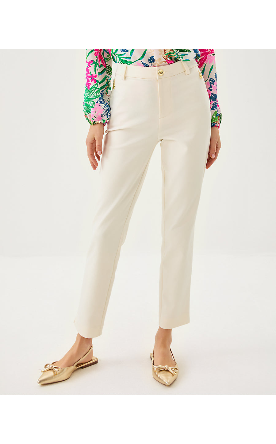 - High rise, ankle-length pant with a straight fit.