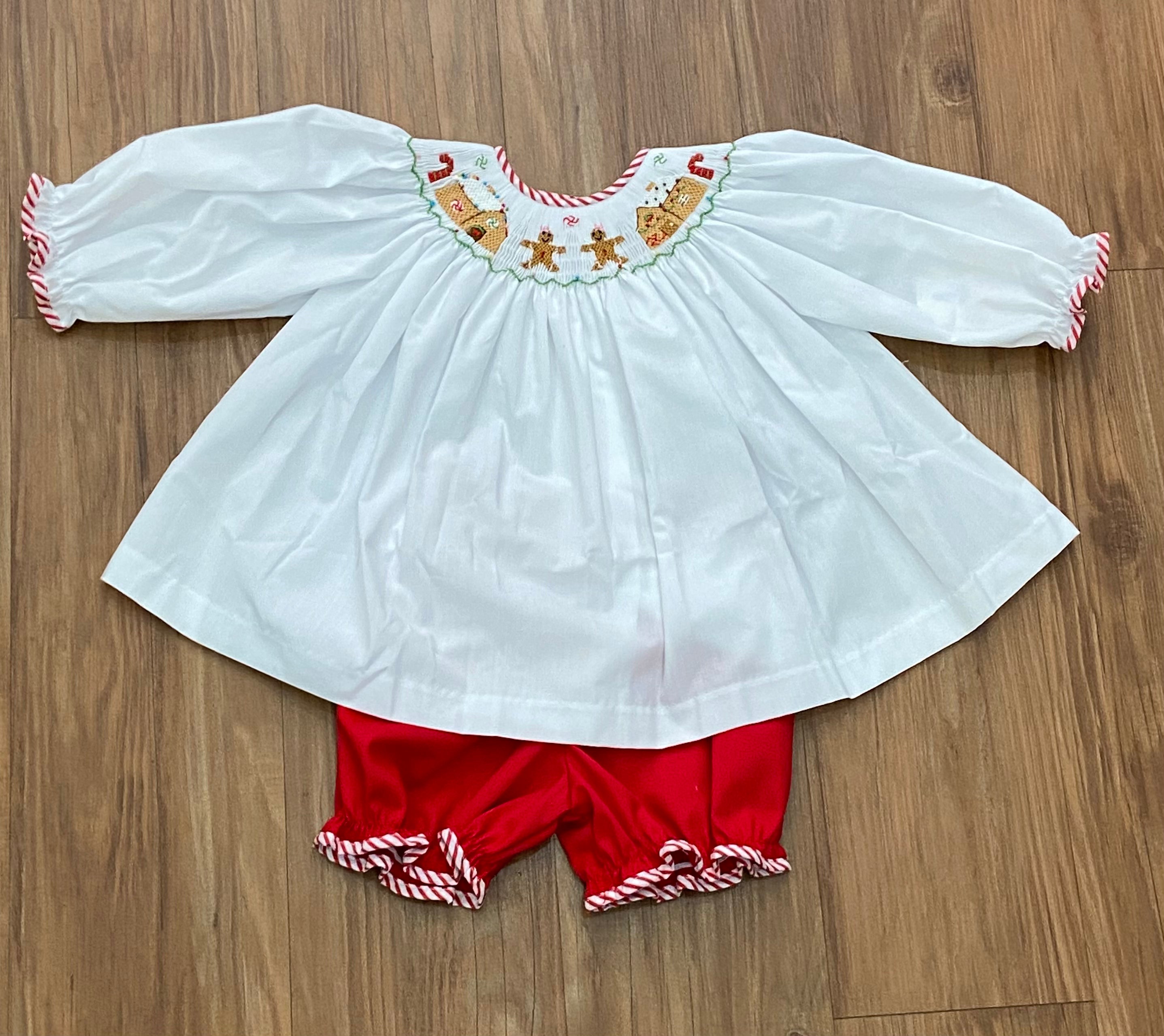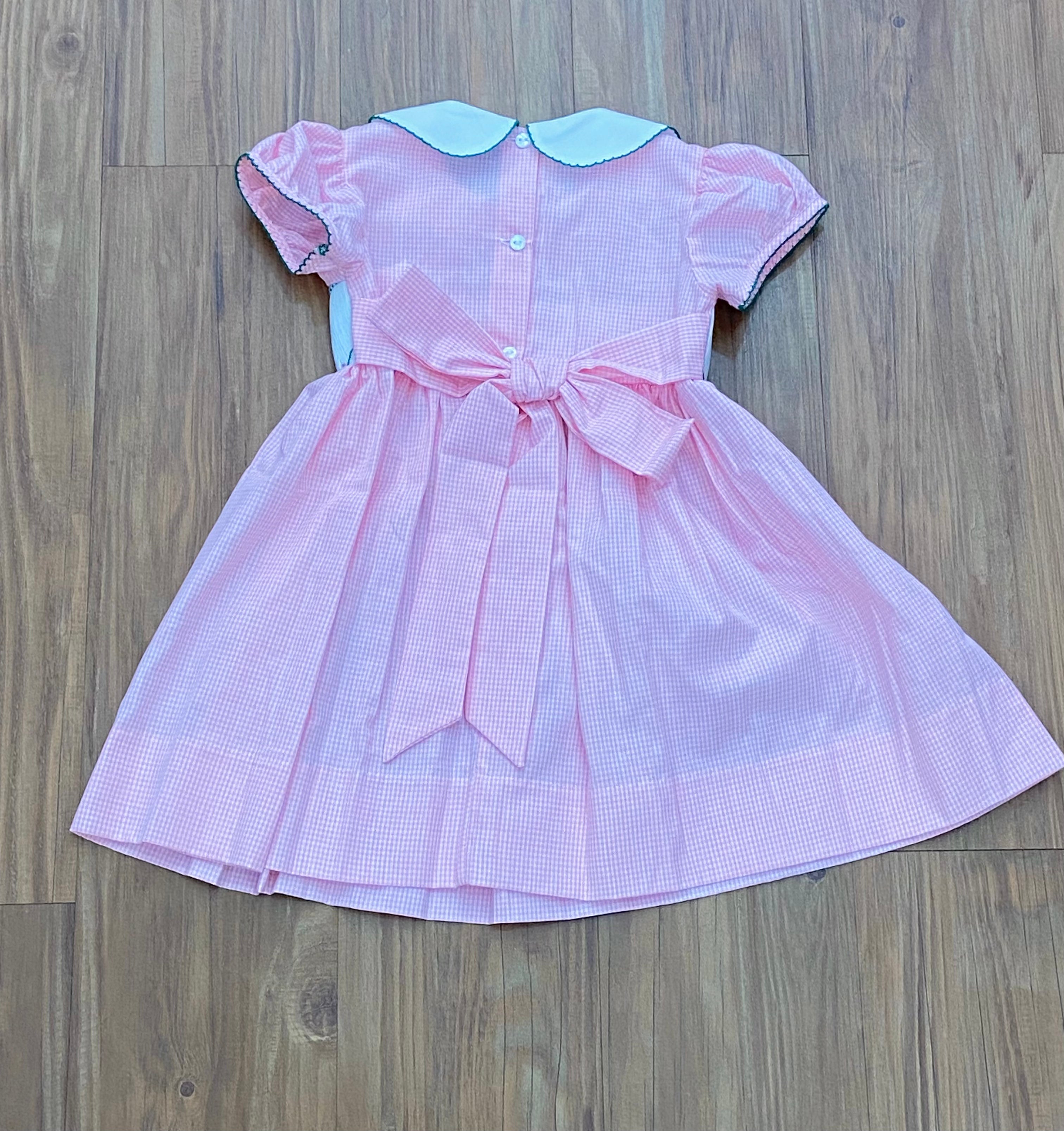 - Classic infant shift dress with a button back closure, trim details, and patch pockets. Style also features lining, hem bows, and matching bloomers.