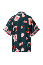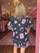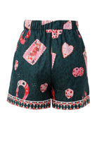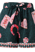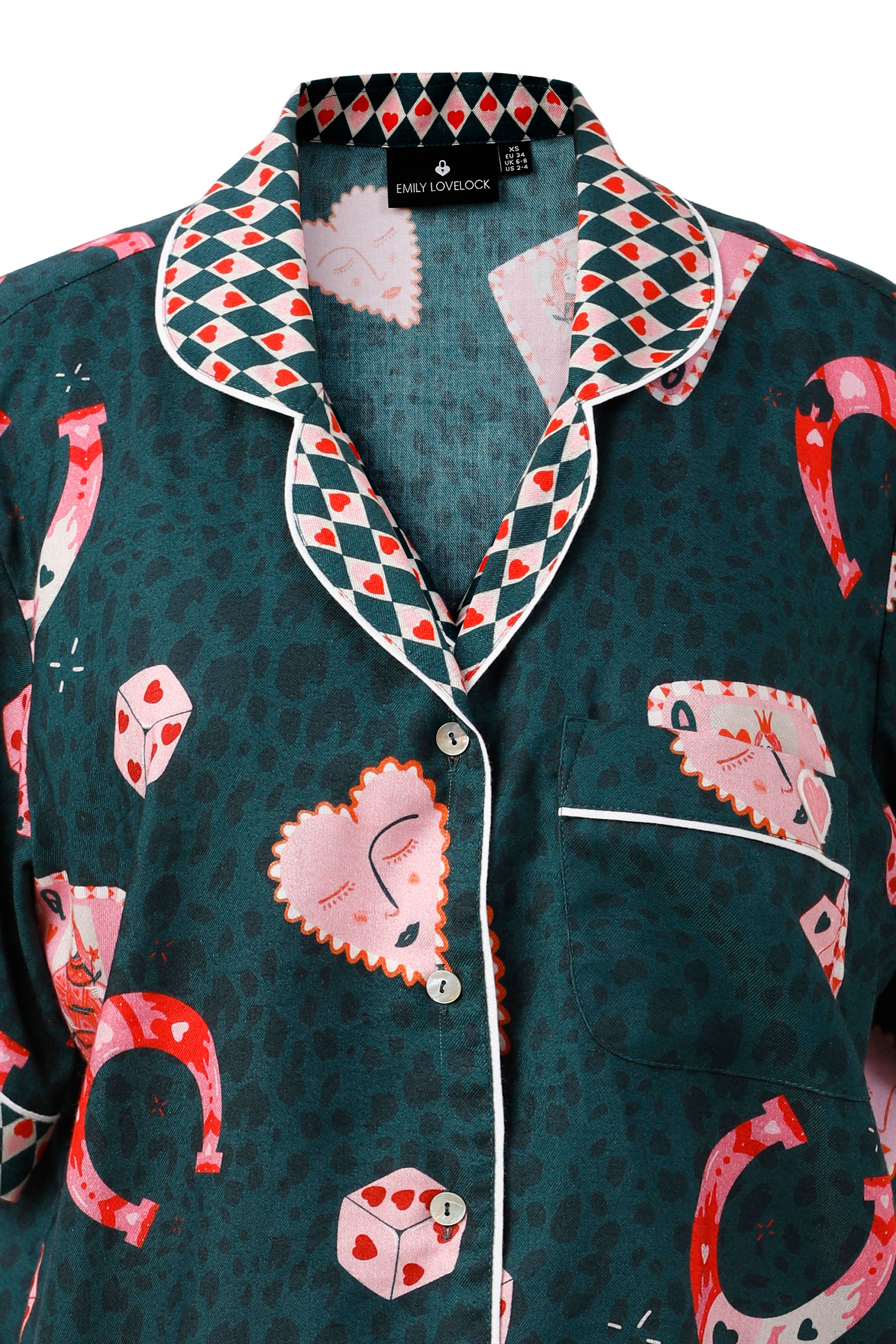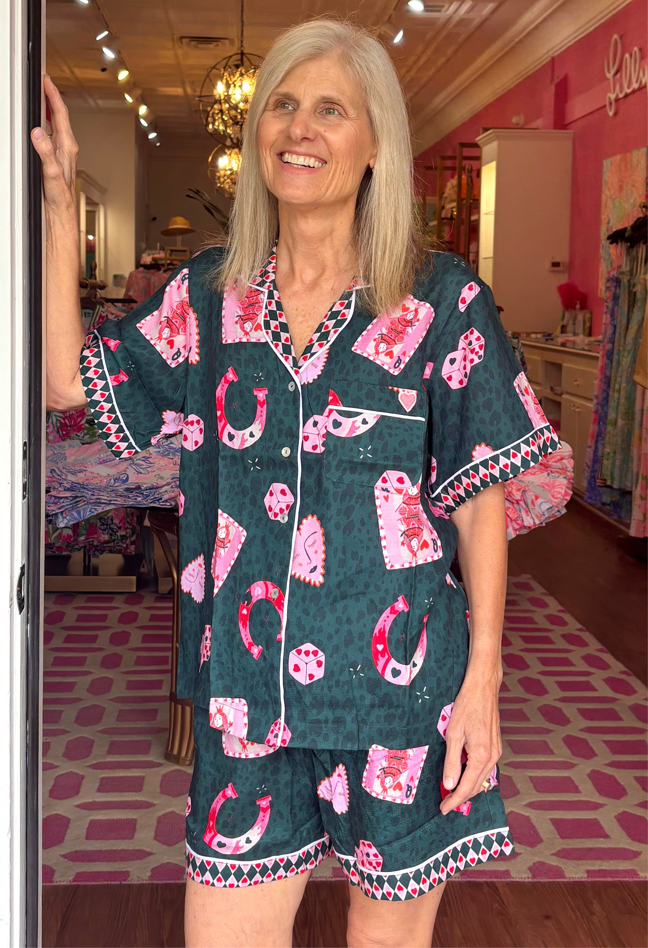 The Betsy Sleepwear Set features a captivating all-over print that beautifully blends whimsy with a touch of classic charm. Against a sophisticated dark moss green backdrop, you'll discover an array of playful motifs: delicate pink Queen of Hearts playing cards, lucky red horseshoe charms, intriguing dice with heart pips, and whimsical heart-shaped faces. This unique pattern is subtly overlaid on a tonal leopard print, adding a layer of sophisticated texture and depth that truly sets this sleepwear apart.