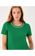 - Straight fit top with short sleeves and an embellished crew neckline.