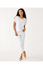 • Straight fit top with short sleeves and an embellished crew neckline.