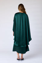 Make an unforgettable entrance in the Corinth Cape Dress. Crafted from luxe satin in a rich balsam hue, this elegant midi dress features dramatic cape sleeves that flow beautifully with every step. A deep V-neckline and fluid silhouette create a timeless yet modern look — perfect for holiday parties, weddings, or any occasion that calls for effortless sophistication.