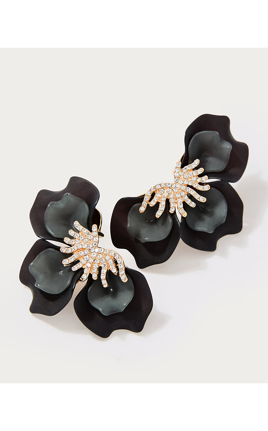 - Coated metal petal earring with a rhinestone center.