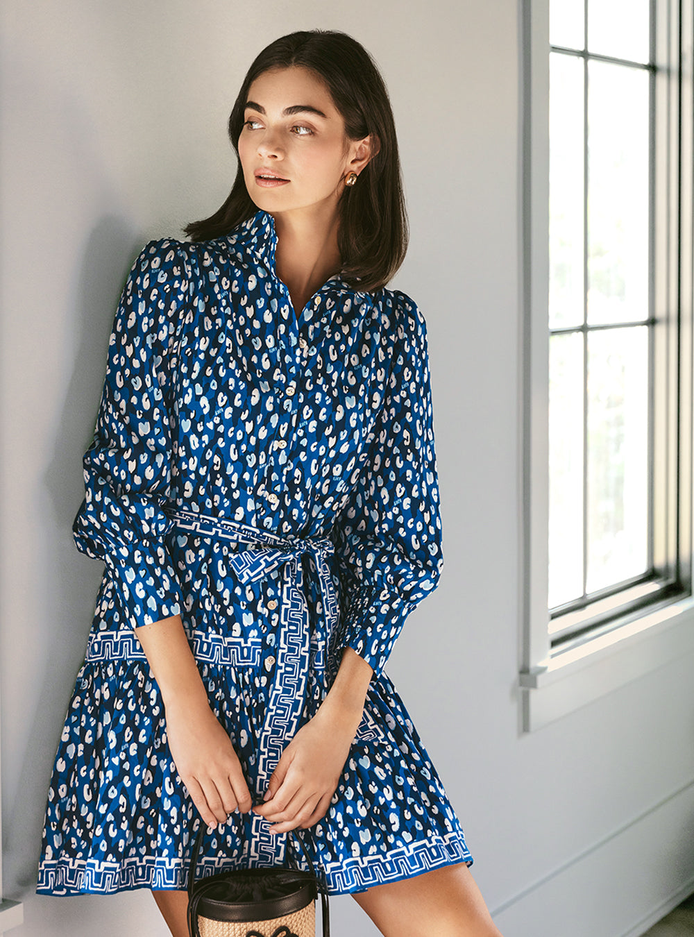 20" Easy fit shirtdress with stand collar, full button placket, 3/4 length sleeves with tall cuffs, hem ruffle, and separate sash
