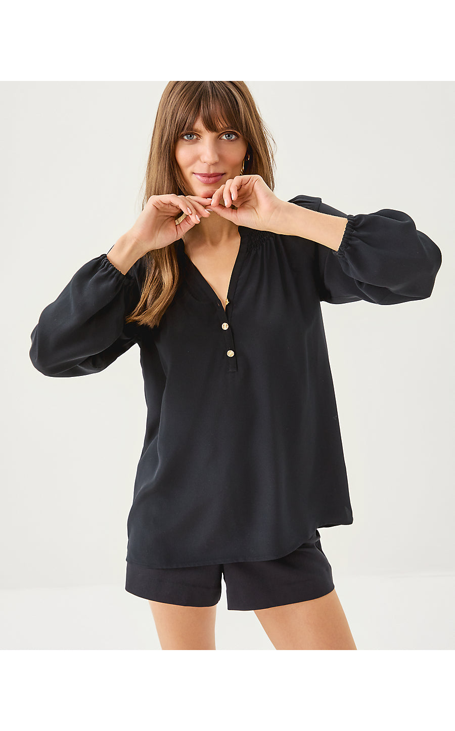 - Easy fit, pullover blouse with gold buttons and bracelet-length sleeves.