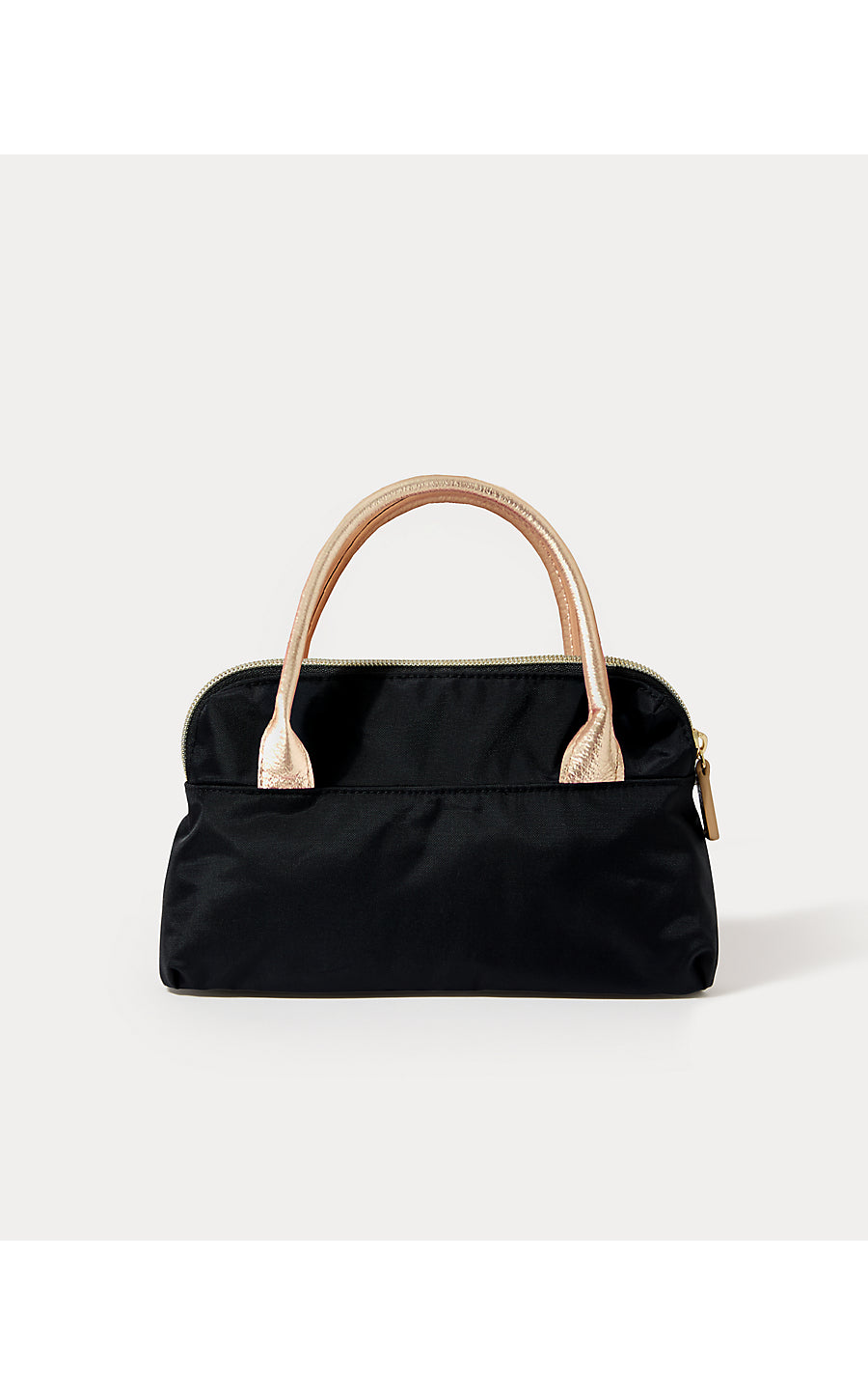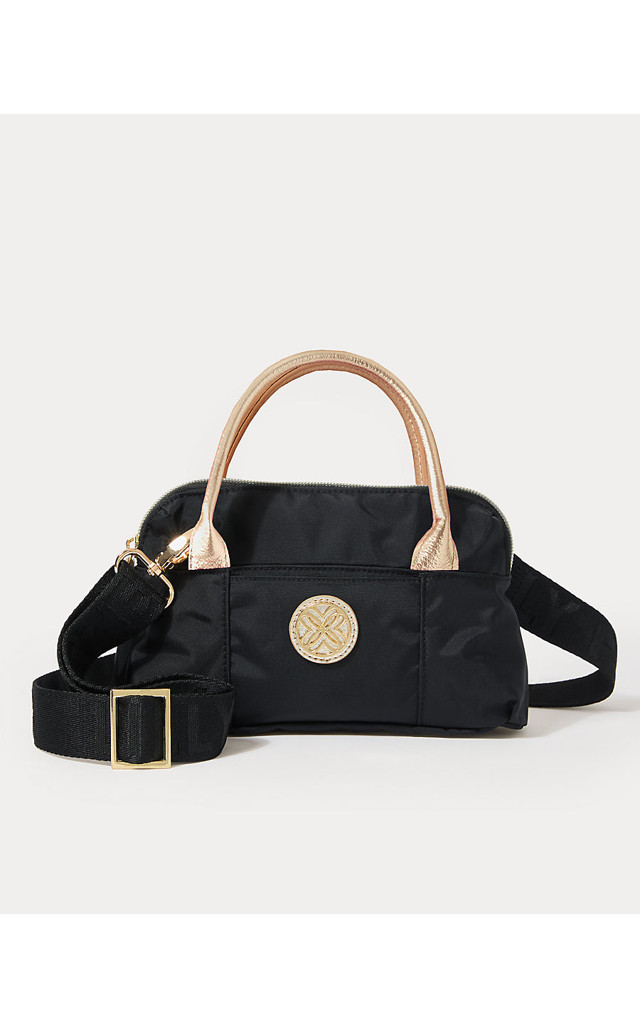 - Nylon top handle mini bag with a front slip pocket, zip top closure, and detachable logo jacquard webbing crossbody strap.