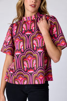 Make a bold and confident statement with the Loucia Top in the striking Gatsby print. This eye-catching blouse features a vibrant mix of pink, fuchsia, olive, and coral tones in a retro-inspired geometric pattern that exudes playful sophistication. The Loucia Top is designed with a structured mock neckline, short puff sleeves, and a relaxed, boxy silhouette—creating a flattering and modern shape that transitions effortlessly from work to weekend.