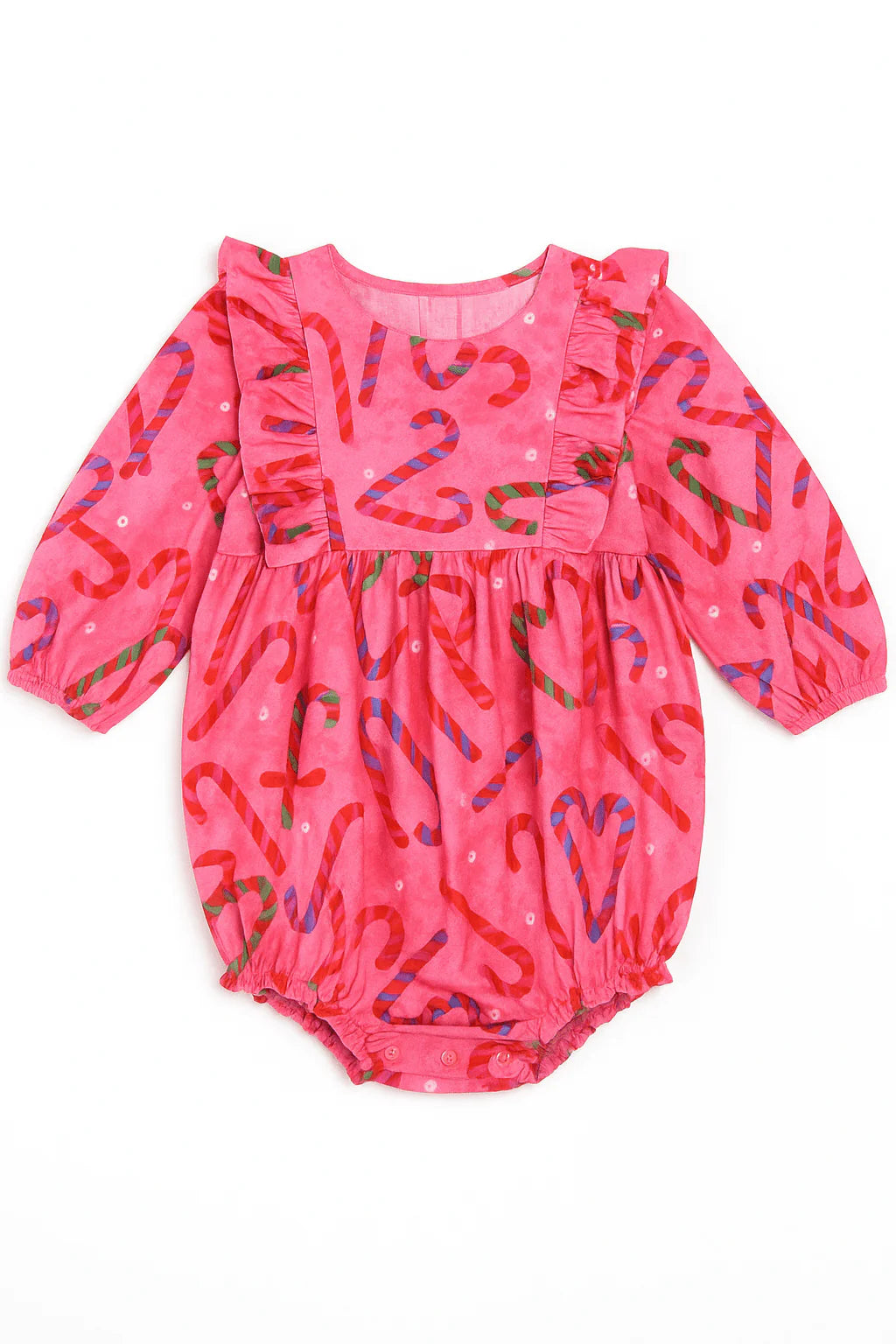pink hue with whimsical candy cane hearts and tiny white dots, this adorable bubble brings all the magic of the season to life. Soft cotton fabric, ruffle trim details, and gathered cuffs make it both comfortable and picture-perfect for family gatherings or festive photos.