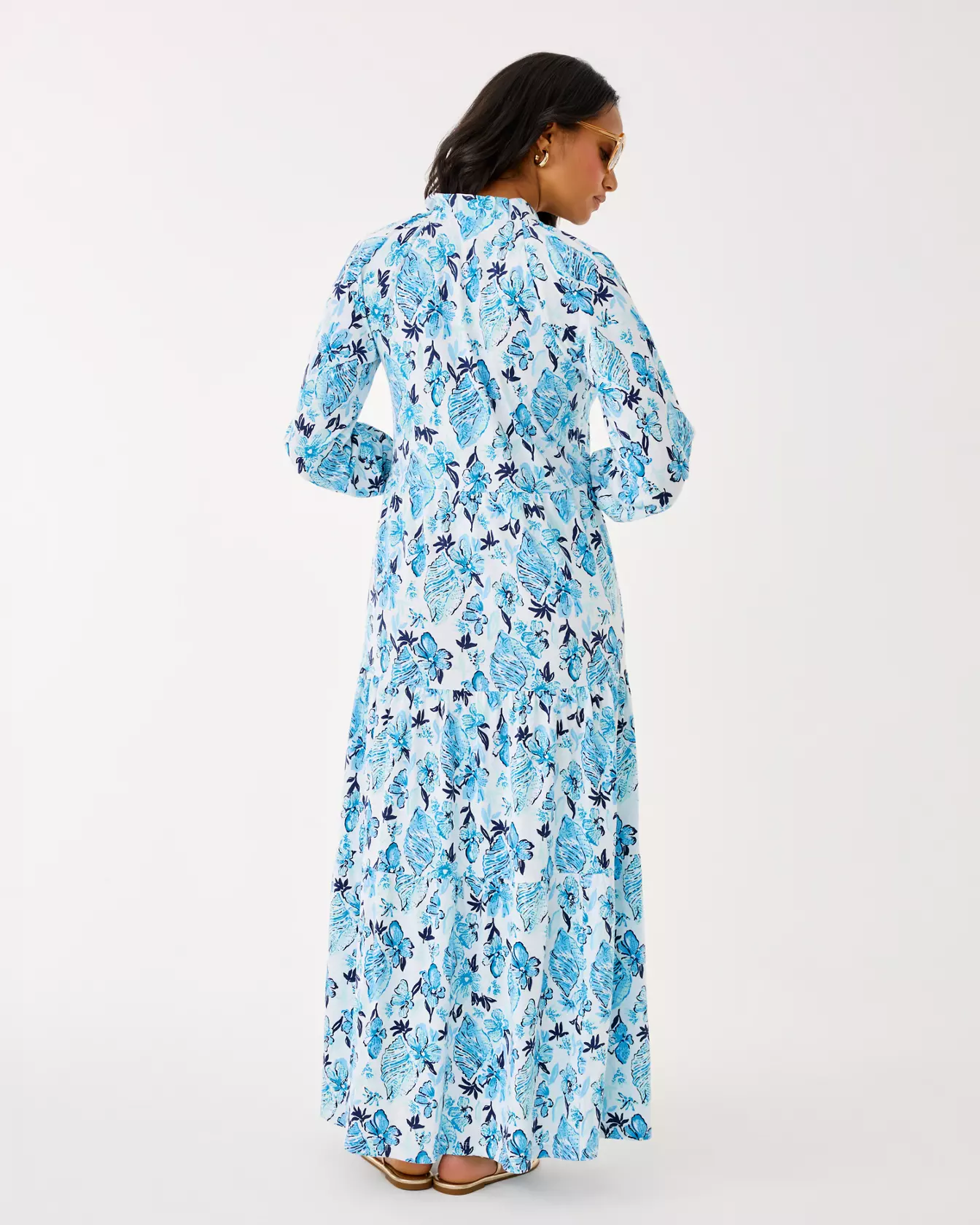 - Swing fit, tiered maxi dress with a ruffled collar, gold buttons, and 3/4 length sleeves with elastic cuffs.