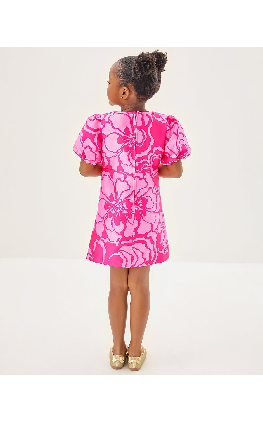 - A-line dress with puff sleeves, a back zipper, and front bow details.