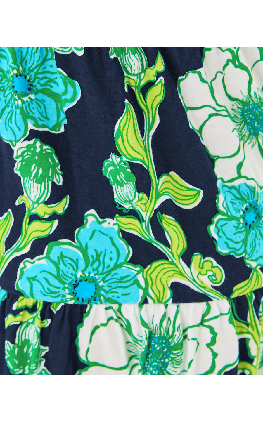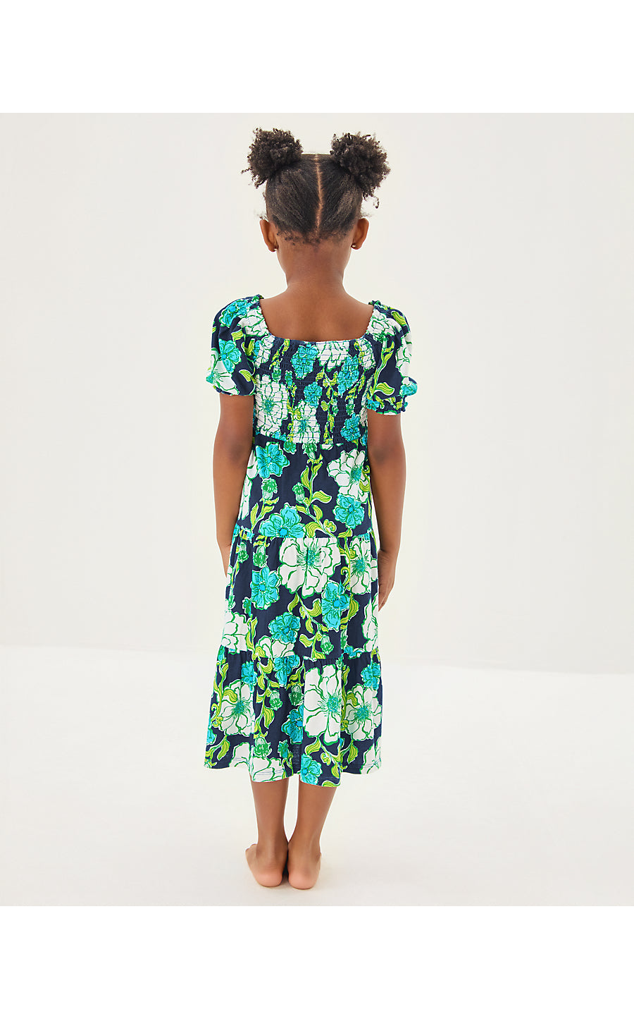 Sweet puff sleeves and a ruffle skirt will make the Girls Mini Jilly Dress a favorite in your little one's closet. This pretty midi dress is comfy, too, thanks to a smocked bodice and printed jersey fabric.