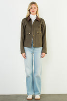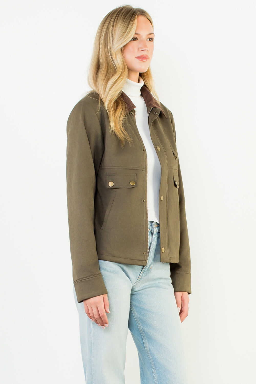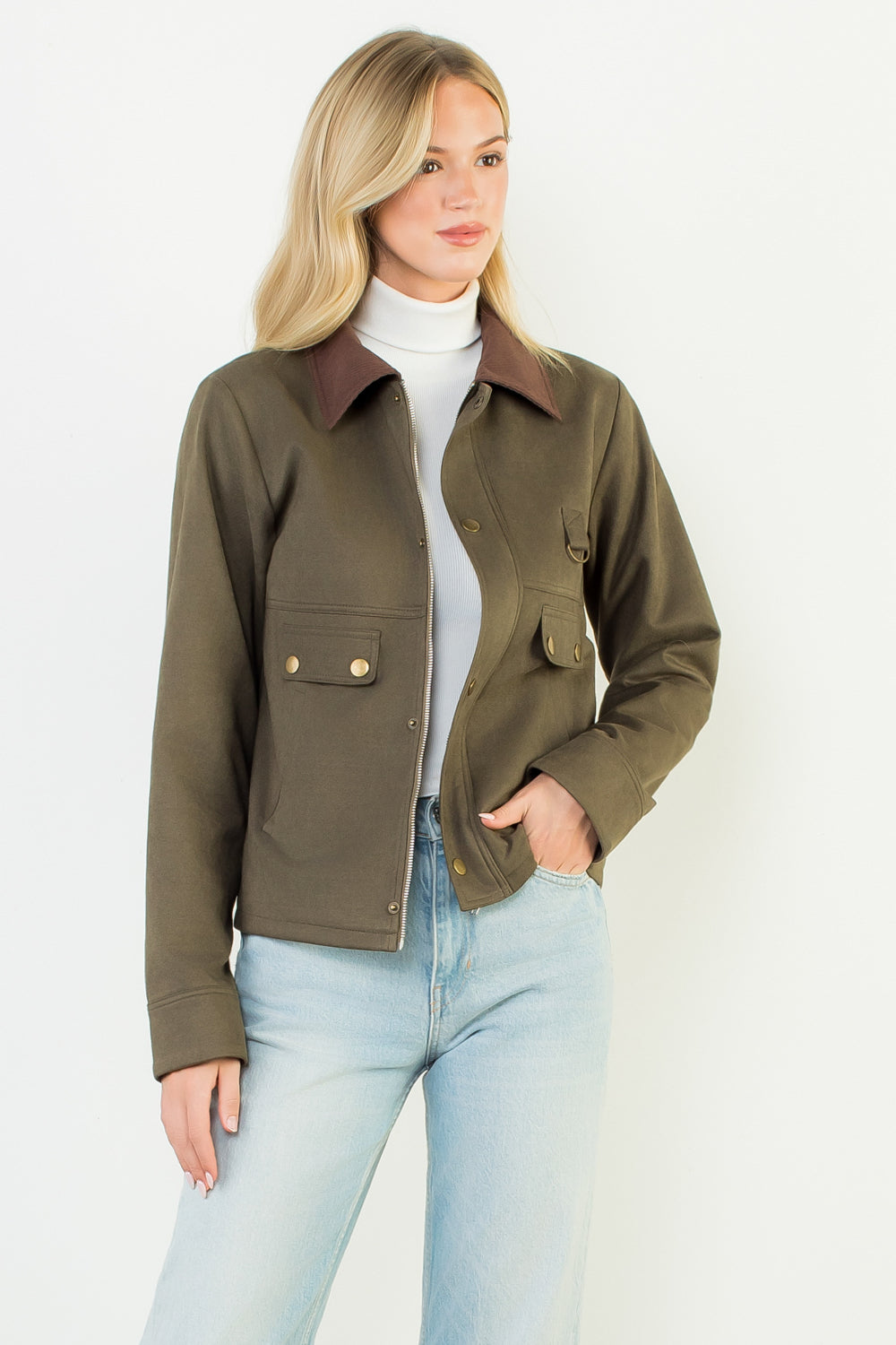 A timeless classic with a modern twist, this olive field jacket is the perfect layering piece for cooler days. Designed with a contrasting brown corduroy collar, functional front pockets with gold snap details, and a zip-and-snap front closure, it blends utility and style effortlessly. Pair it with denim and a turtleneck for a polished, everyday look that transitions seamlessly from town to countryside.
