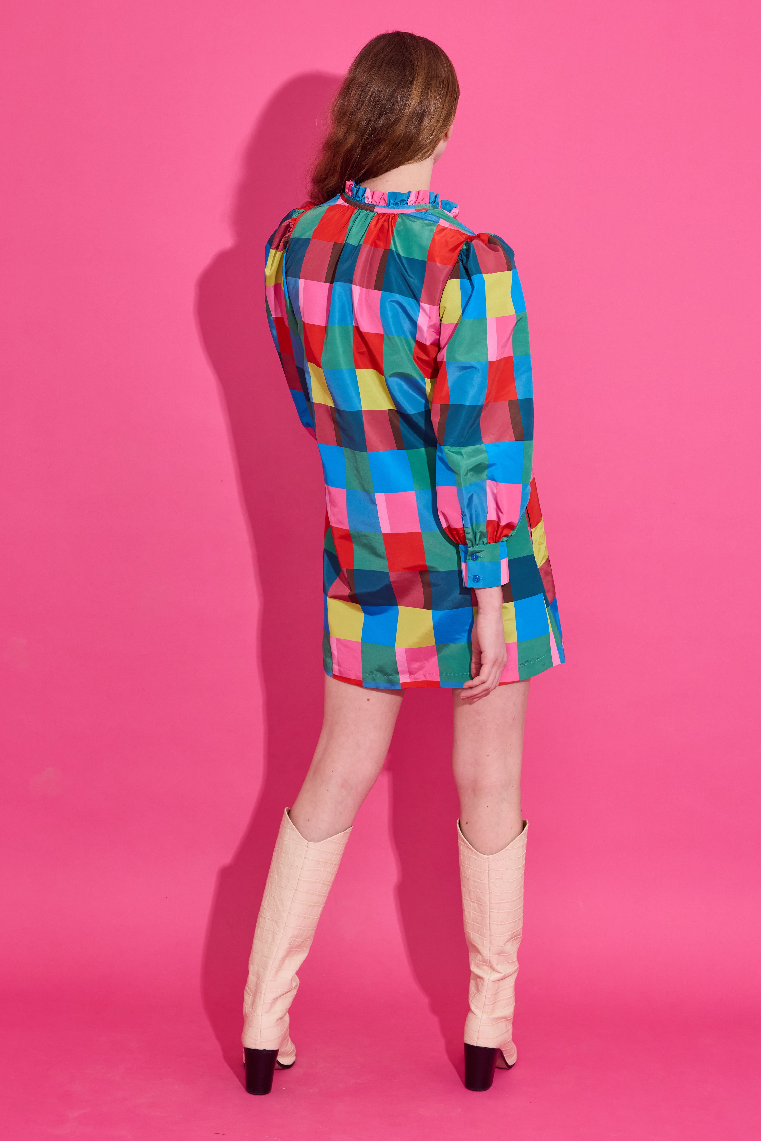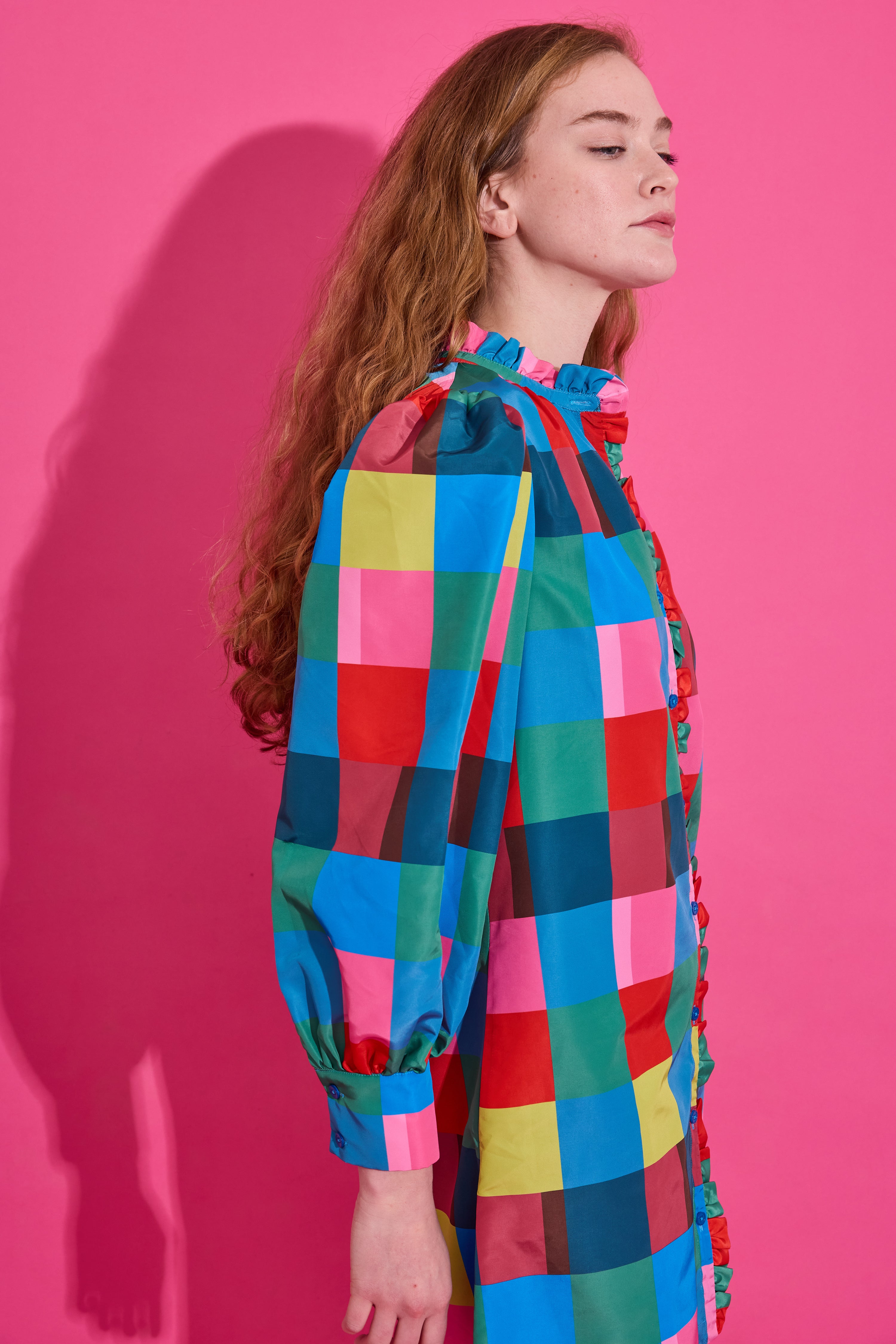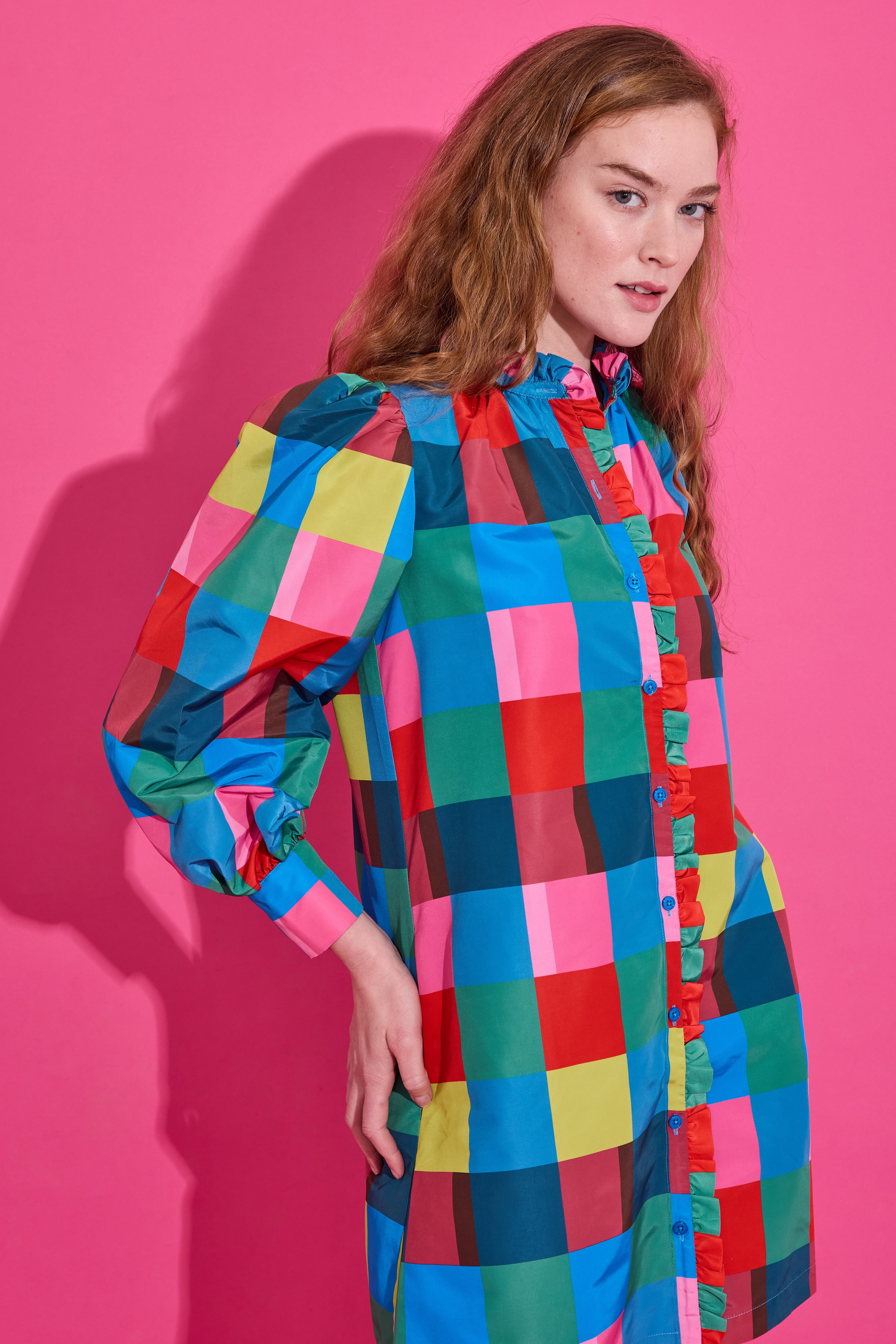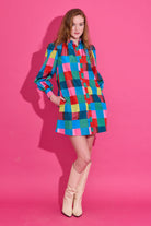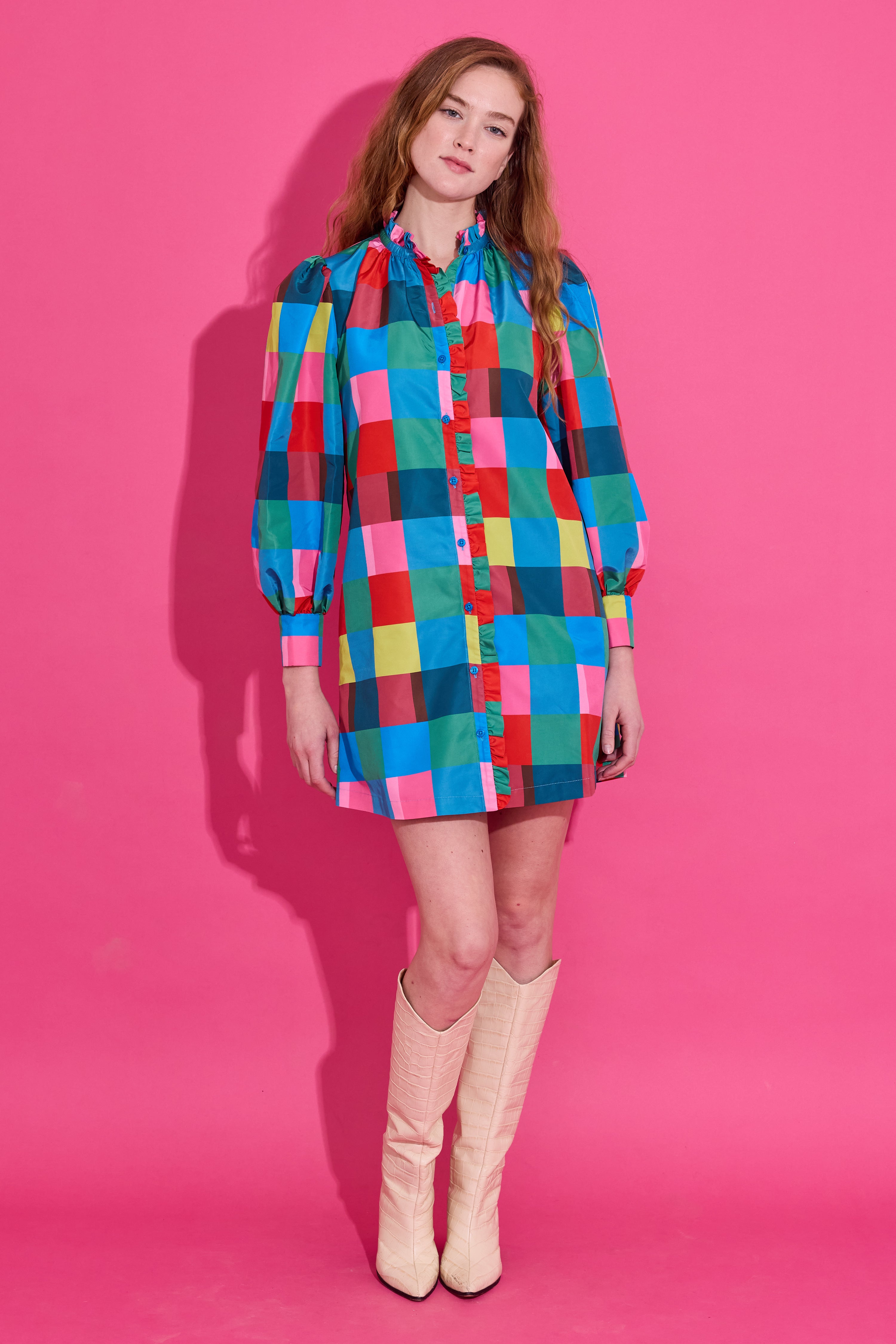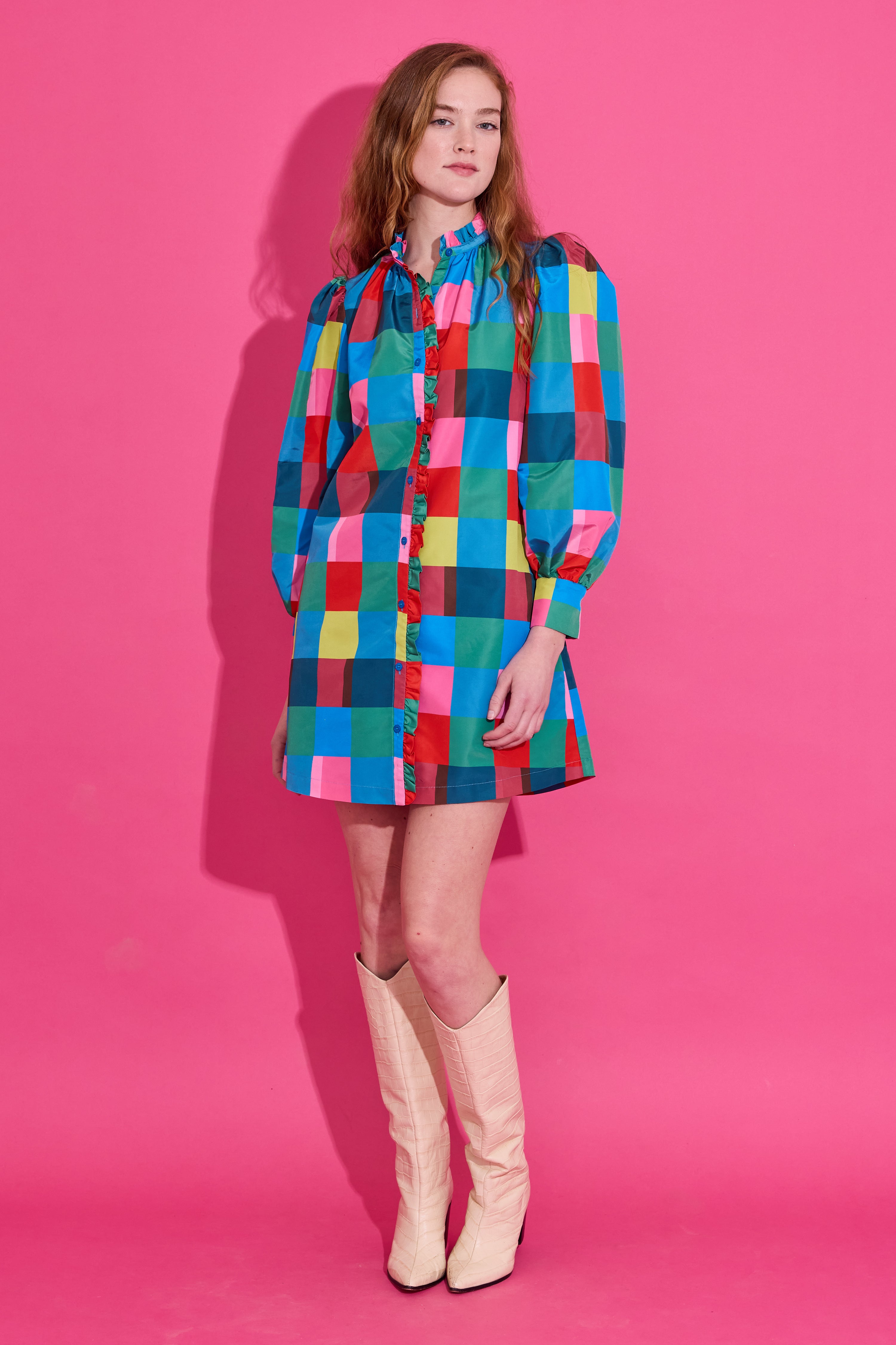 Bright, bold, and made to stand out — the Nora Dress brings playful polish to your wardrobe. Featuring a vibrant check print and easy button-front silhouette, this dress is perfect for everything from brunch to your next getaway. The ruffled neckline and puff sleeves add just the right touch of feminine flair, while the relaxed fit keeps it effortlessly comfortable. Pair it with boots or sandals for a look that’s fun, fresh, and full of color.