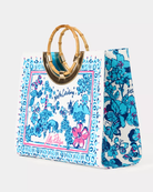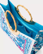 - Printed canvas destination tote with round natural bamboo top handles.