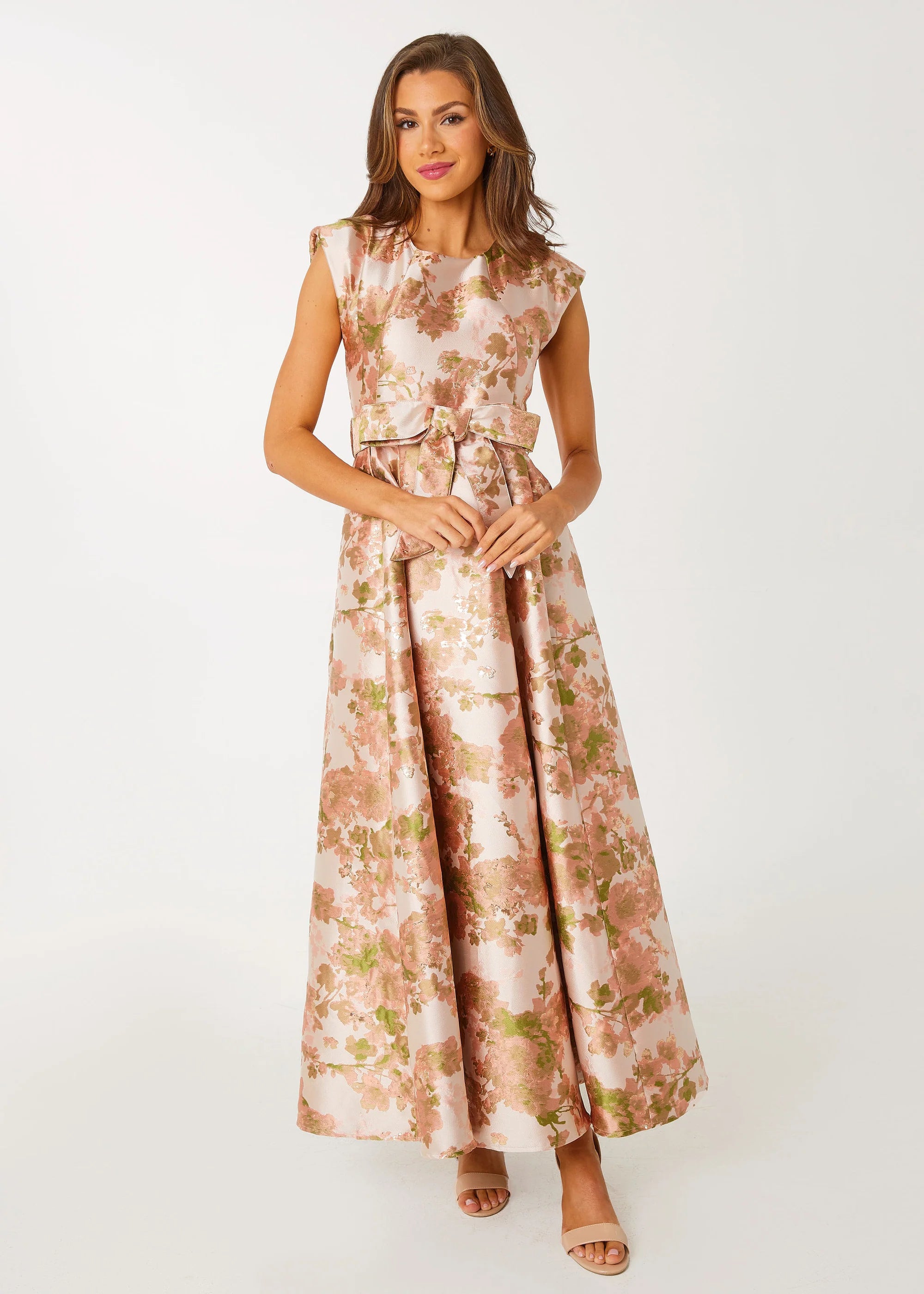 Command the room in the Olivia Gown, a breathtaking evening silhouette in blush baby’s breath jacquard. The soft yet luminous floral pattern brings a modern, romantic touch to classic formalwear, while the lightweight fabric moves with grace and ease. Perfect for black-tie events, or as a timeless choice for the mother of the bride or groom, this gown pairs effortlessly with simple heels and a clutch for an elegant, show-stopping look.