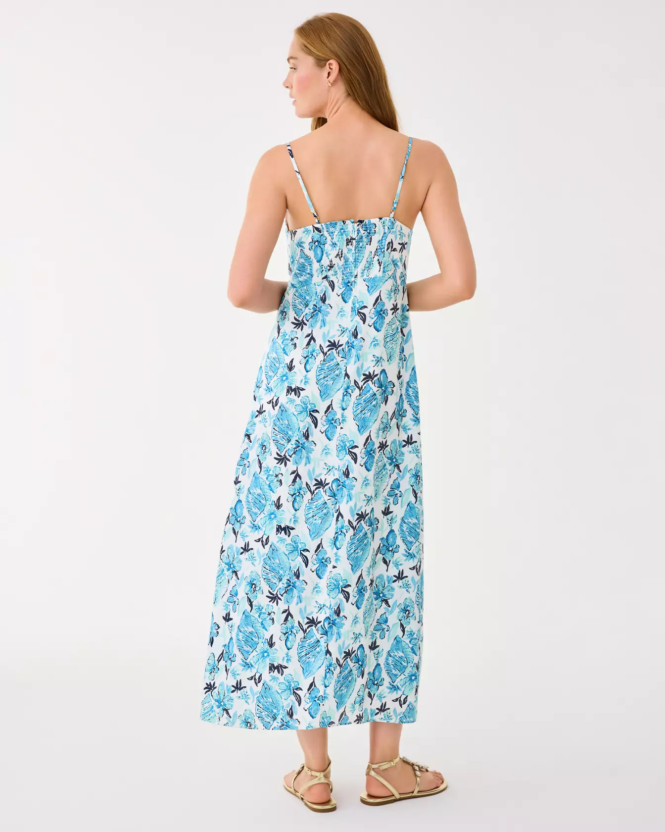 - Fit-and-flare maxi slip dress with adjustable spaghetti straps, a deep v-neckline, bodice cups, and a smocked back panel.