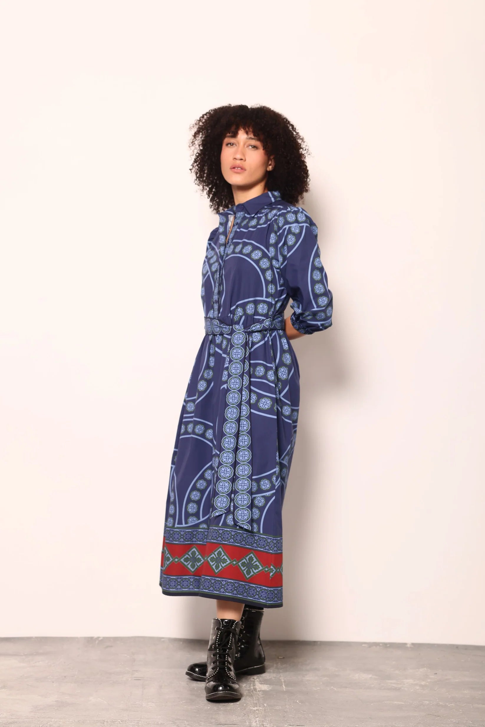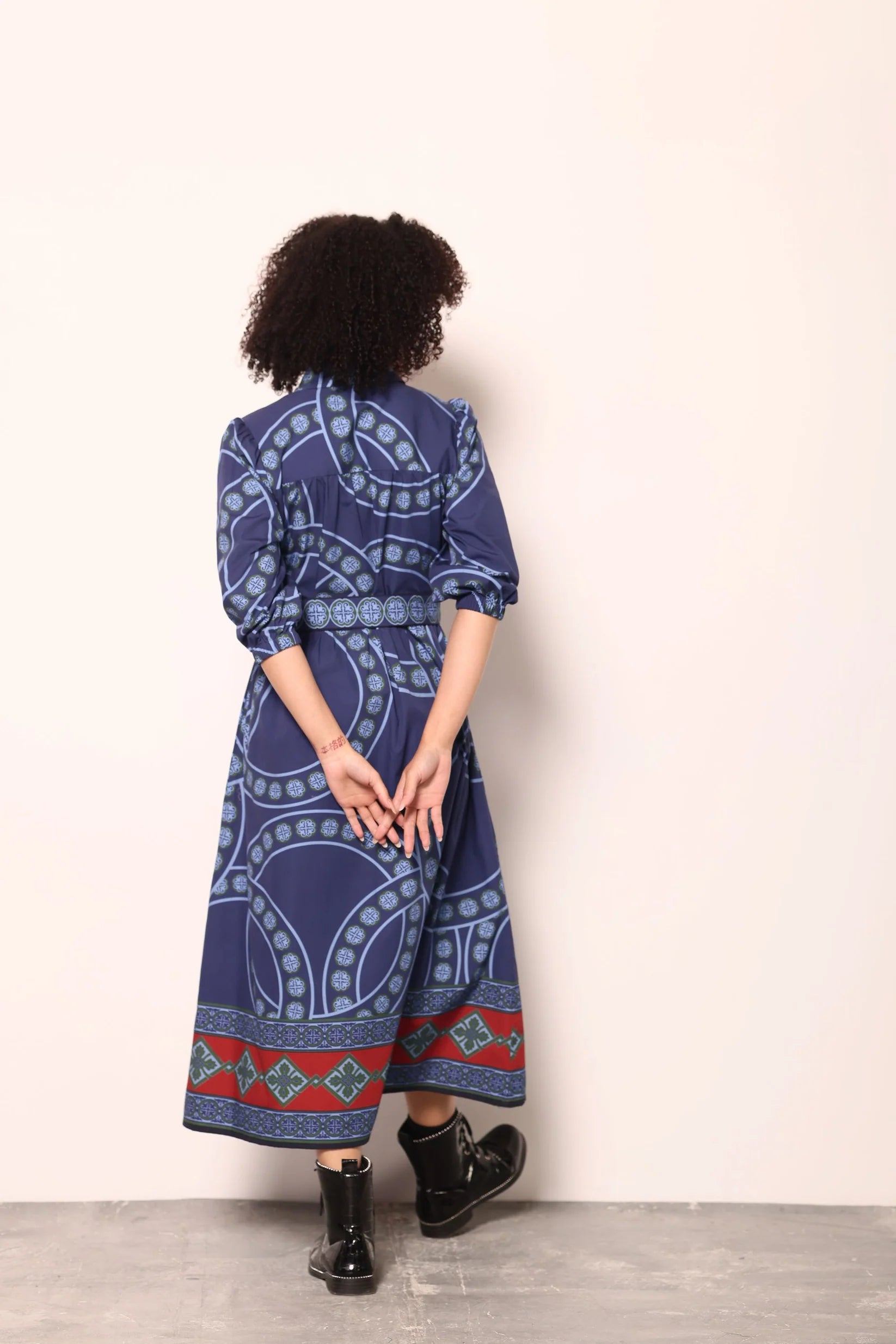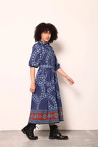 The Remi Dress is where timeless elegance meets bold, modern print. Crafted in a deep navy palette, this stunning maxi features intricate circular motifs in soft blue tones, accented with a striking red and teal border that adds just the right pop of contrast.