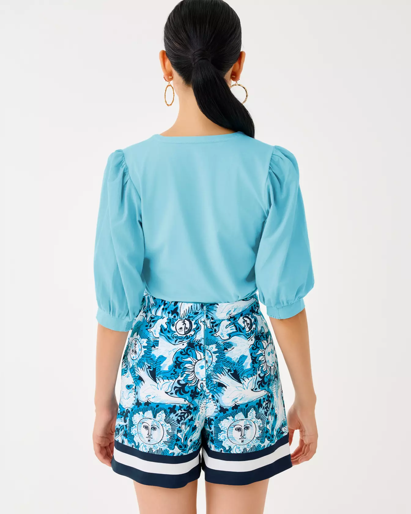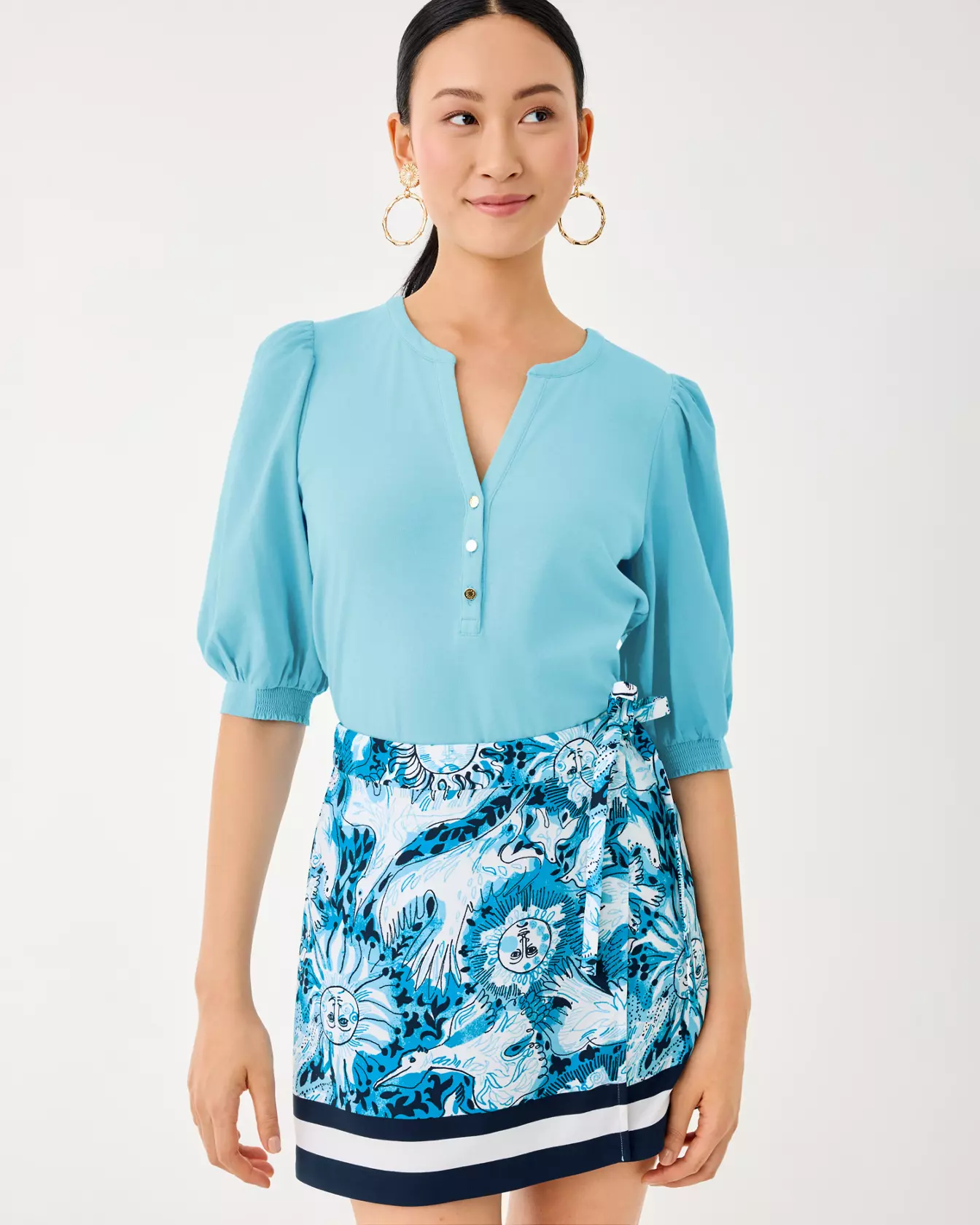 - Straight fit top with puff sleeves, smocked cuffs, buttons, and a crew notched neckline.