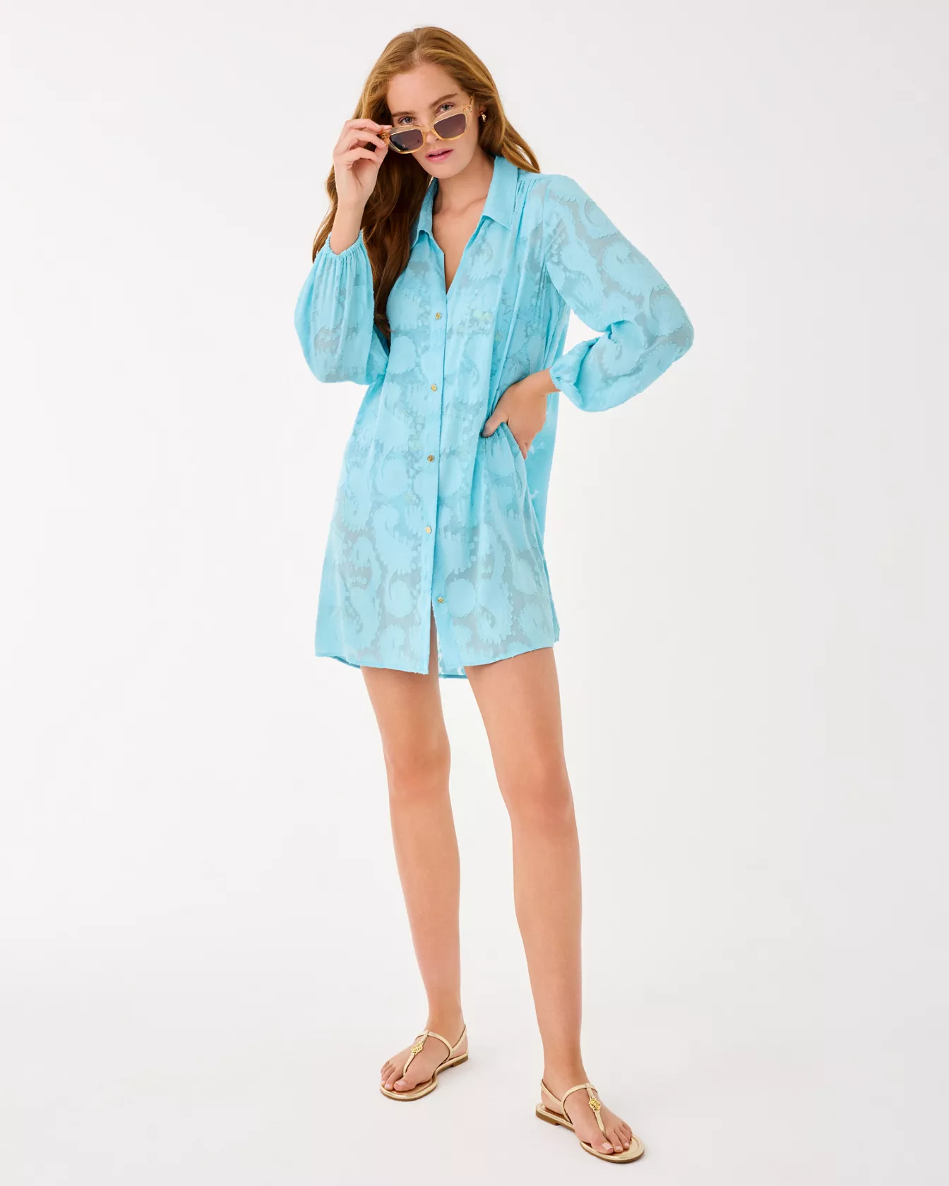 • Easy fit, long sleeve cover-up with a collar and button front.