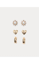 Set of 3 post earrings. Pearl and rhinestone stud, gold heart an hoop.