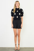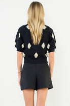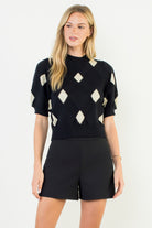 Classic meets contemporary in this chic argyle sweater. Featuring a textured diamond knit pattern in black and cream, this short-sleeve style offers a flattering, slightly cropped fit with ribbed trim at the neckline, cuffs, and hem. The subtle puff sleeves add a feminine touch, making it perfect for pairing with tailored shorts, denim, or a sleek skirt for an effortlessly polished look.