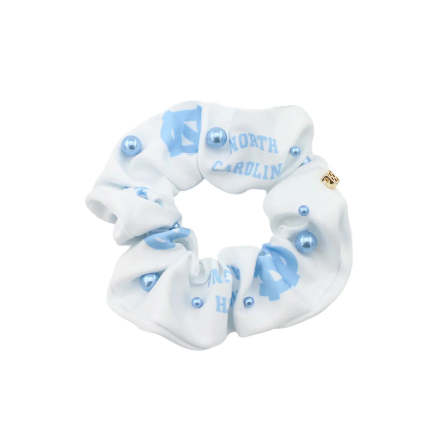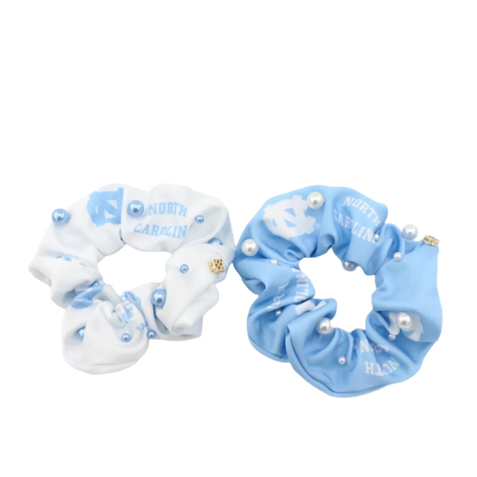 - White and Blue University of North Carolina Logo Dual Scrunchie with Pearls