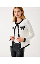 • Sweater set featuring a shell top and a matching long sleeve, crewneck cardigan with contrast trims, pockets with bow trim details, and buttons.