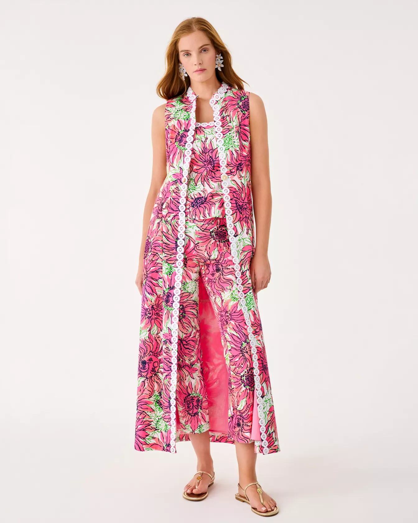 - Fitted, sleeveless, button front duster vest.