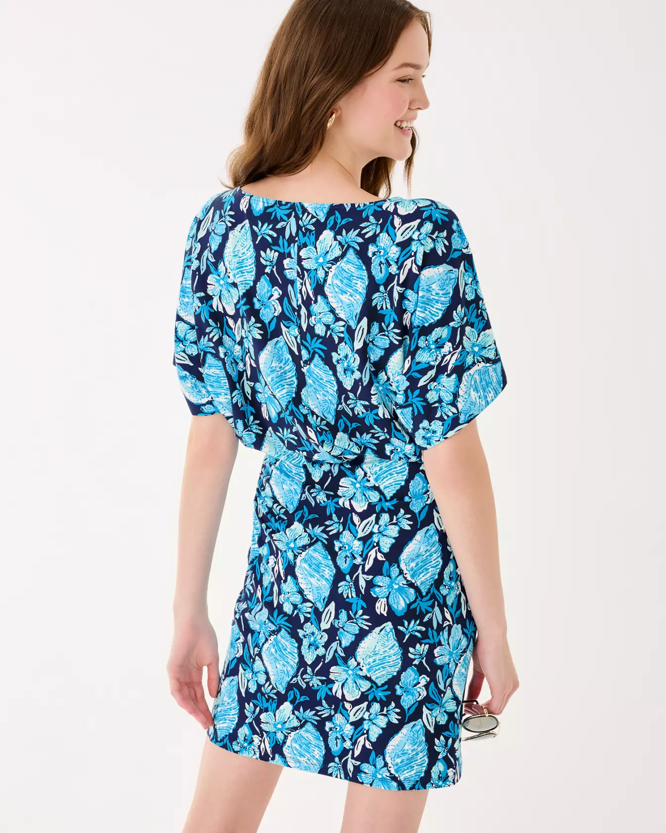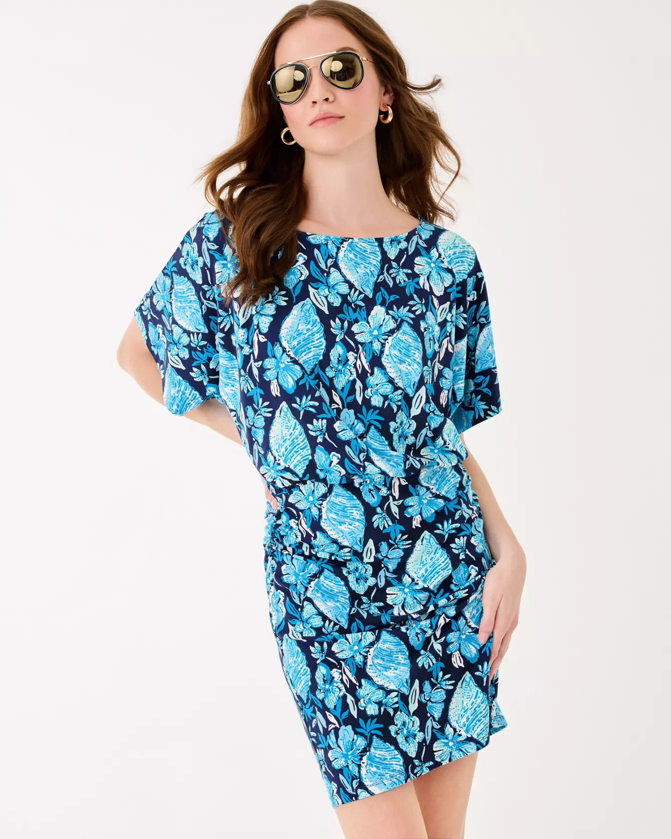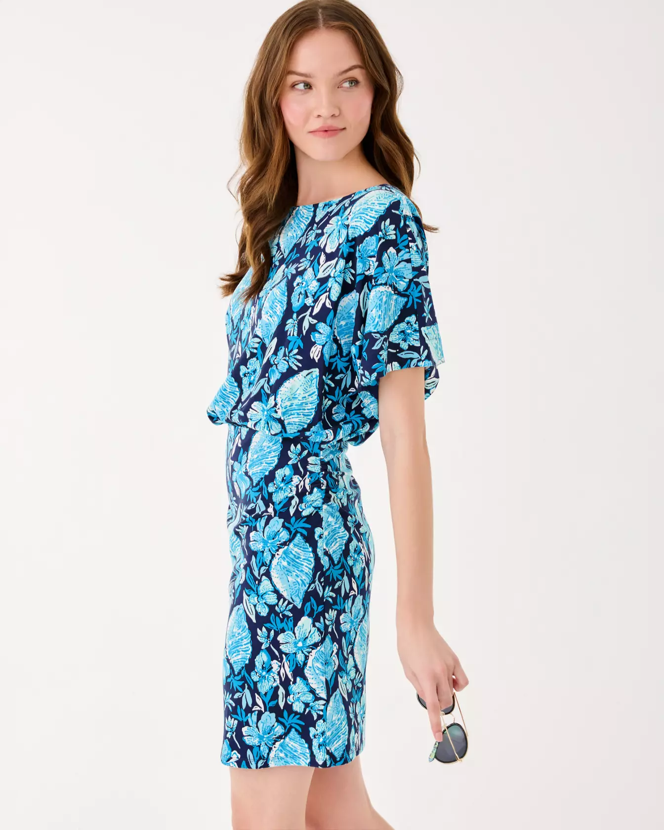- Easy fit, boatneck dress with short sleeves, a blouson bodice, and a fitted skirt with a ruched waist.