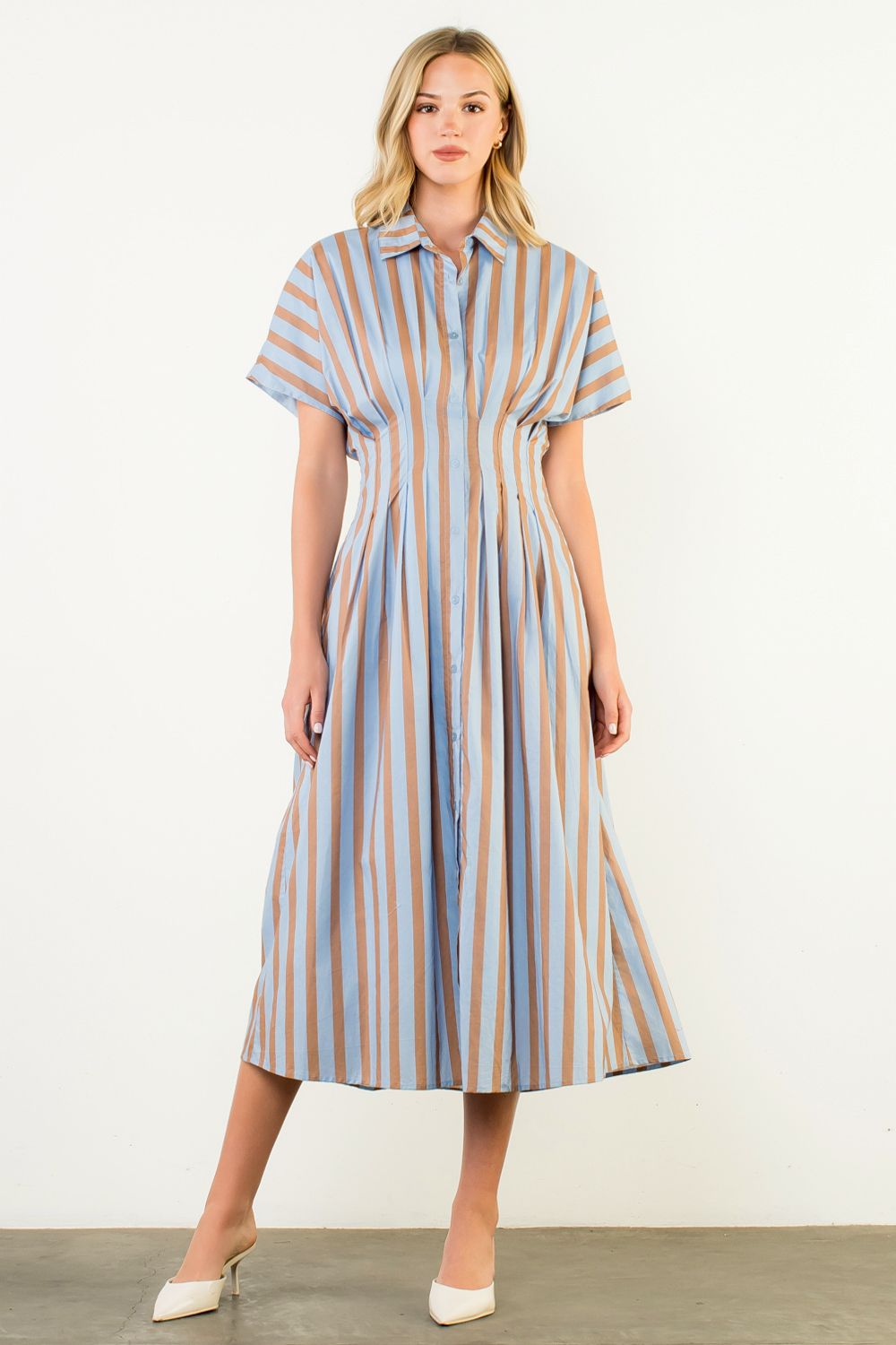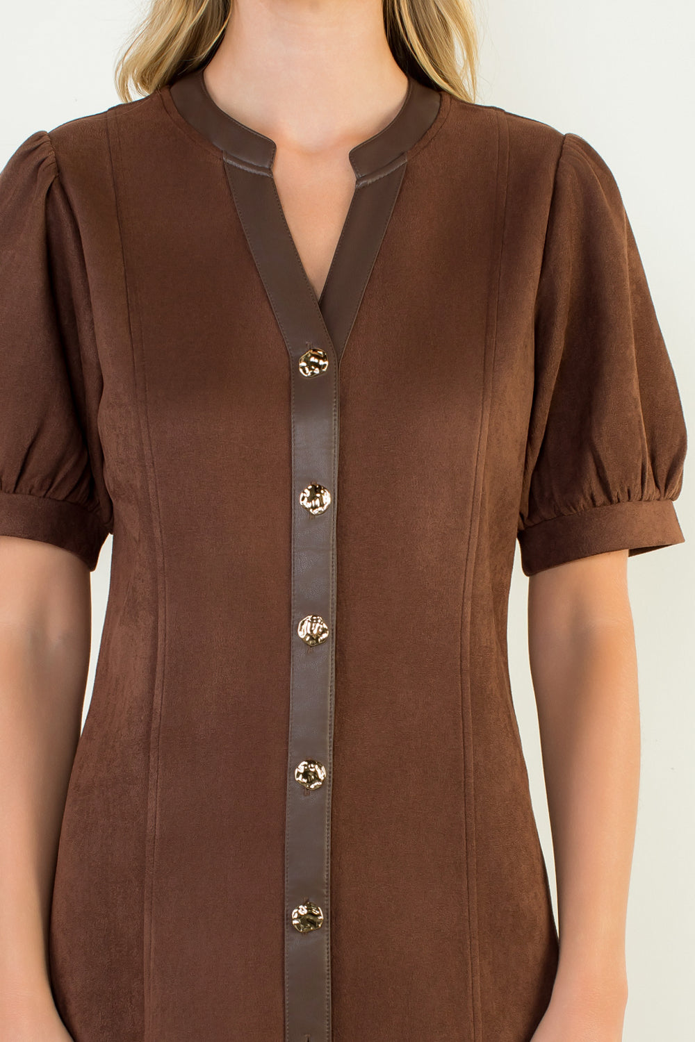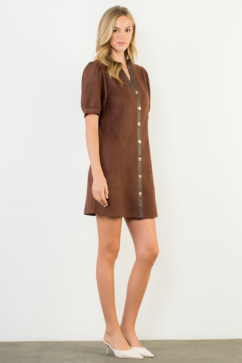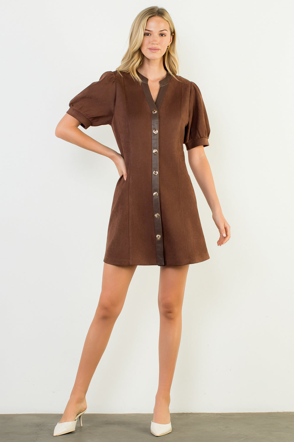 Puff Sleeve V-Neck Button Up Suede Dress - Brown