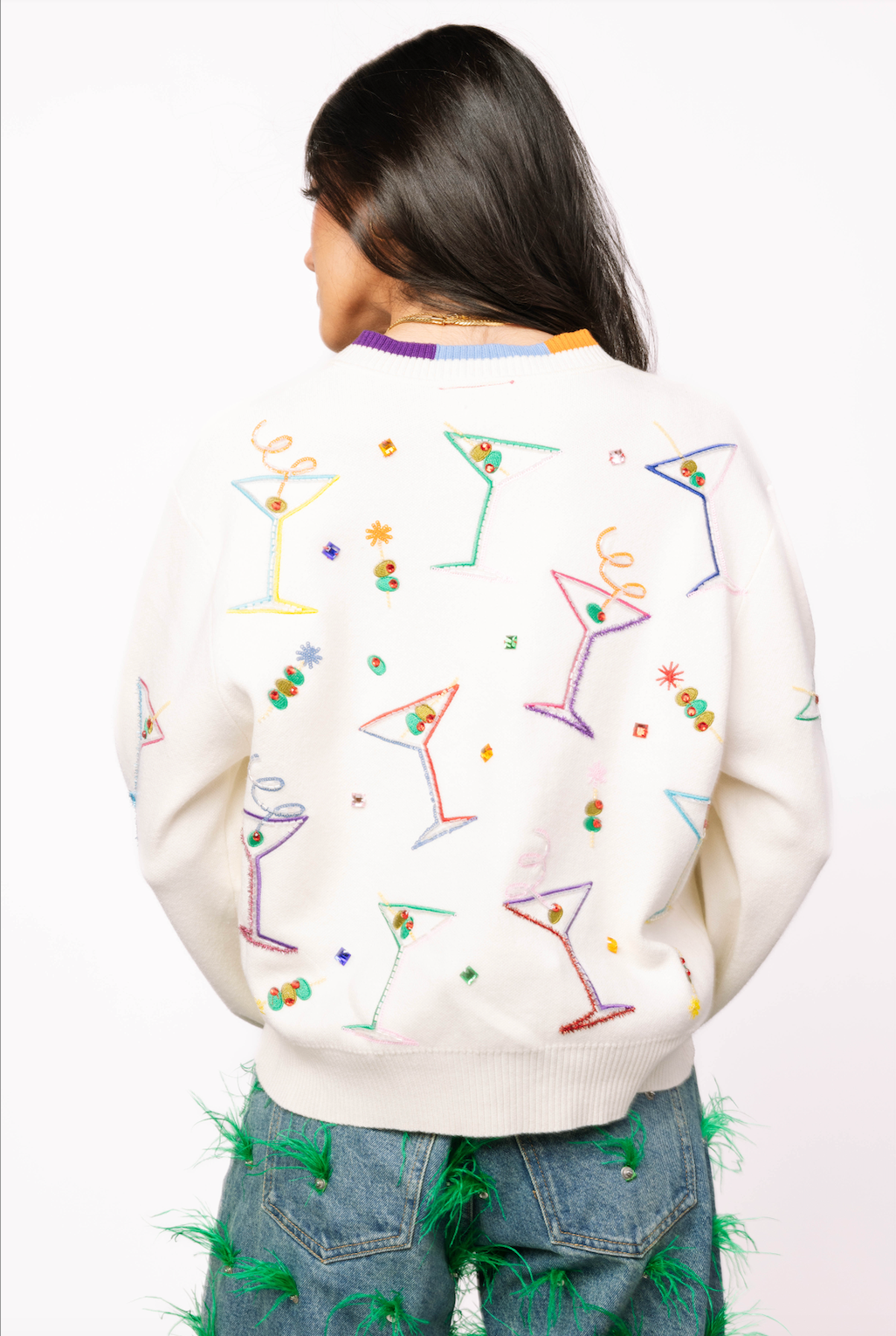 White Multi Cosmo & Martini Button Up Cardigan with Rainbow Trim