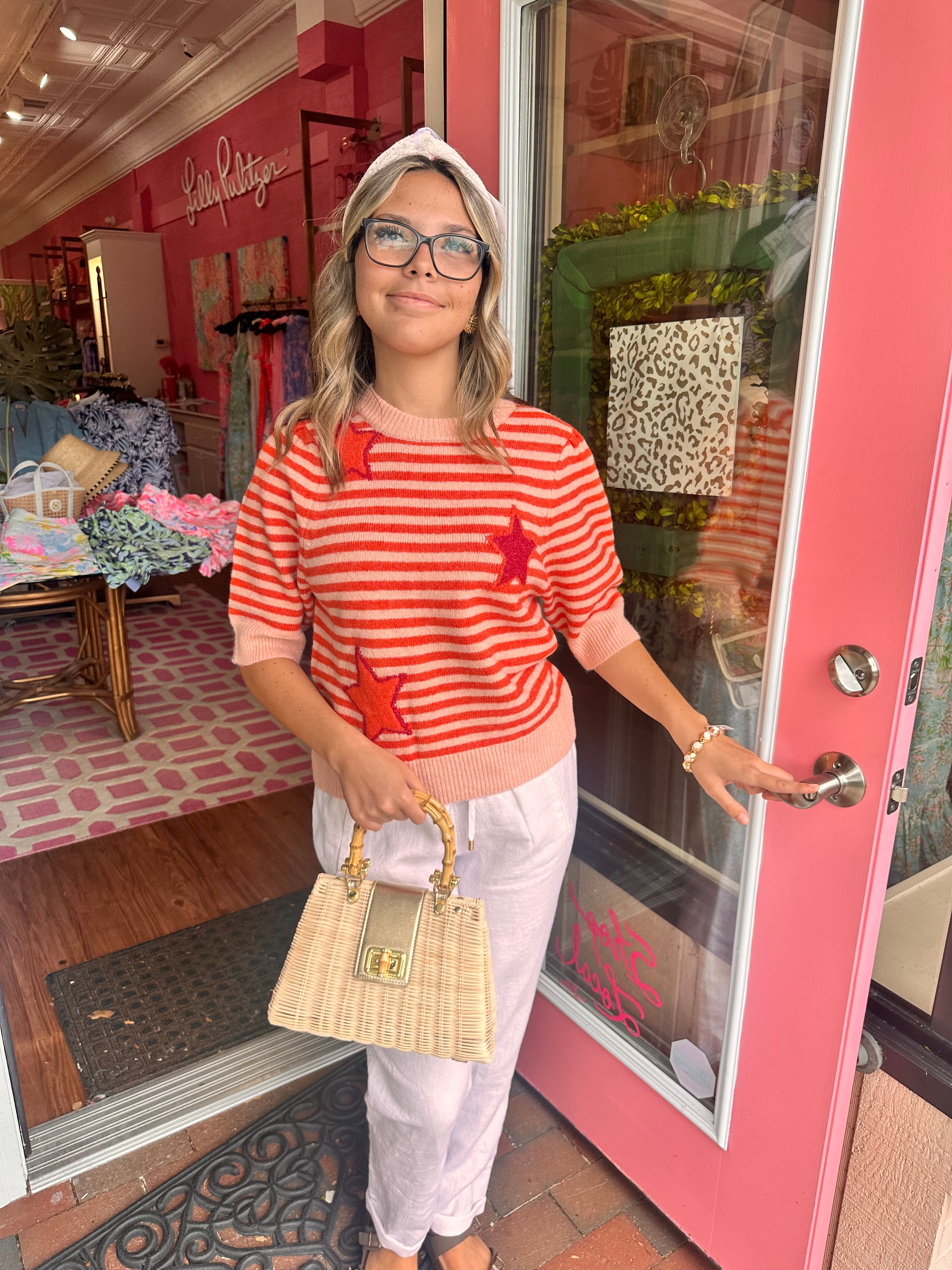 This playful knit top features bold red and blush pink stripes with vibrant star appliqués for a fun pop of personality. Its soft, slightly cropped fit and cozy short sleeves make it the perfect statement piece for a casual day out or a cozy boutique look.