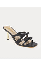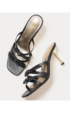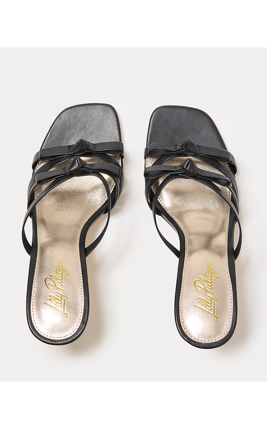 - Strappy slide sandal with a gold electroplate heel and a plush padded footbed.