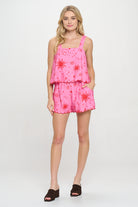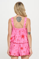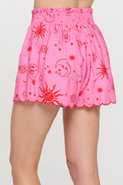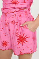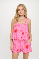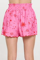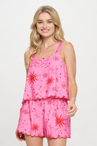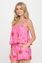 Get starry-eyed over this playful pink two-piece set, printed with whimsical celestial suns, moons, and eyes in vivid red. The breezy tank-style top features a relaxed fit with scalloped hem detailing, perfectly paired with matching high-waisted shorts for an effortlessly fun, flirty look. Lightweight and comfortable, it's your go-to for poolside lounging, vacation days, or casual summer fun.
