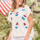 Show off your patriotic spirit with the Emily Top. Featuring embroidered red, white, and blue popsicles, this top adds a playful Americana touch to your look. With cap sleeves and a relaxed fit, it's perfect for celebrating the season in comfort and style.