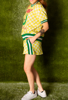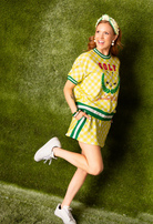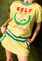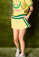 - Skirt features red athletic shorts attached underneath, elastic waistband, and pockets