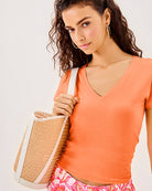You'll want to grab this tee in every color and print under the sun. Meredith is a soft cotton jersey style tee with a V-neckline.