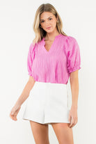 This breezy pink top features playful puff sleeves and a flattering v-neckline. Perfect for sunny days and seaside strolls.