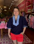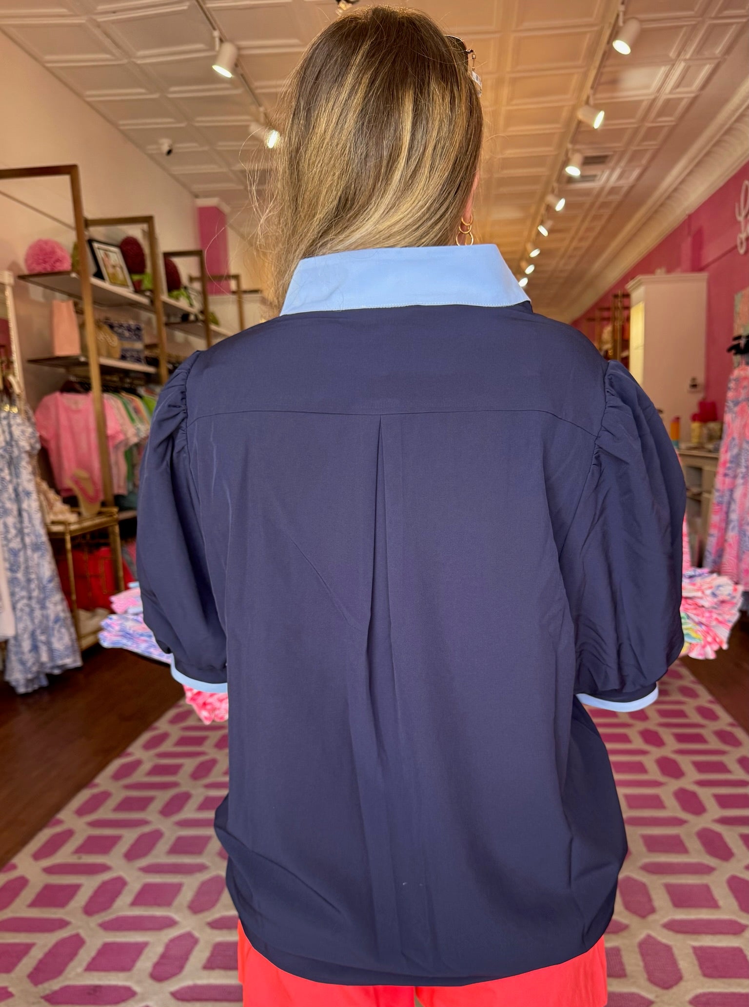 This navy blouse features a striking light blue V-neck panel and matching sleeve cuffs. With puffed short sleeves and a structured silhouette, it offers a bold yet feminine look perfect for polished everyday style.