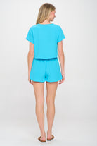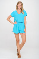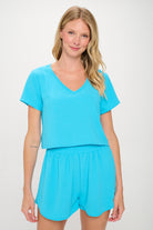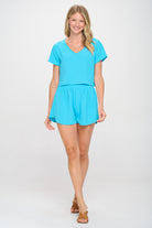 The top boasts a flattering V-neckline and short sleeves, providing a relaxed and airy feel. The high-waisted shorts feature an elastic waistband for a snug yet comfortable fit, ensuring ease of movement throughout the day. The classic black color adds a touch of sophistication, making this set an essential part of your summer wardrobe.