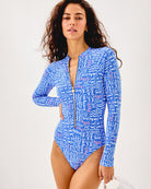 Sporty style meets sun protection in our Randee Rashguard One-Piece Swimsuit. This long-sleeve swimsuit makes a splash with a gold front zipper and sleek high-cut leg.