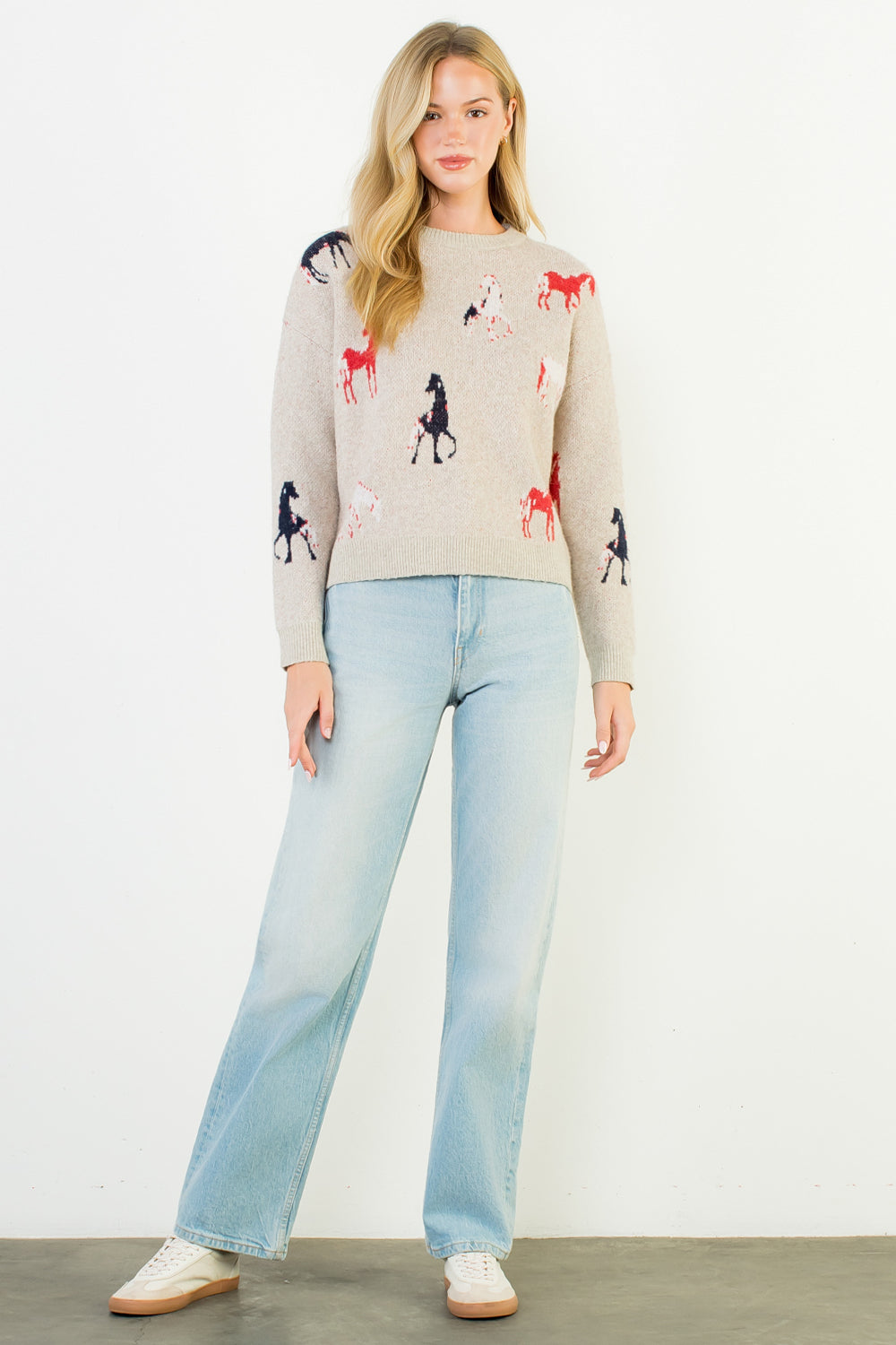 Made from a luxuriously soft knit fabric, the Horse Detail Sweater offers warmth without the bulk, keeping you comfortable through changing seasons. The design features a flattering, slightly relaxed fit that drapes effortlessly while maintaining a polished look. The charming horse detail adds a hint of whimsy, while ribbed cuffs, hem, and neckline provide structure and texture for a refined finish.